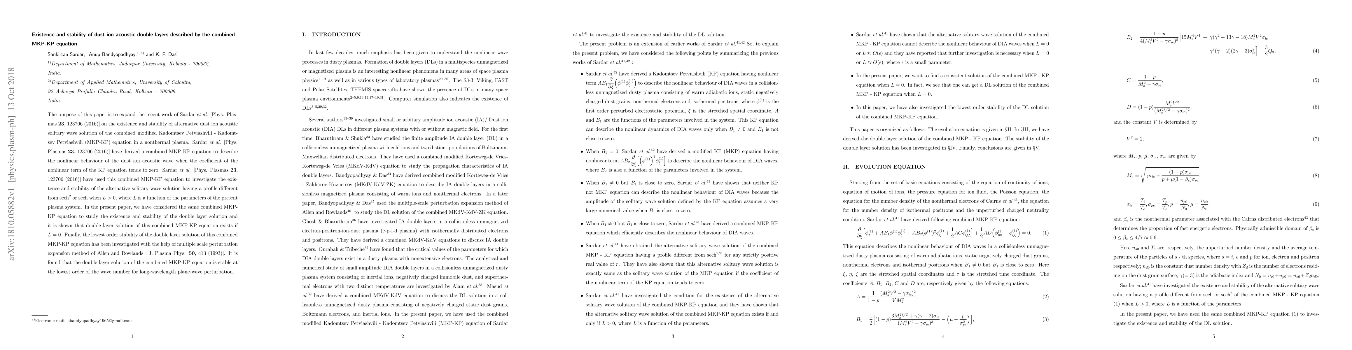 The purpose of this paper is to expand the recent work of Sardar et al. [Phys. Plasmas 23, 123706 (2016)] on the existence and stability of alternative dust ion acoustic solitary wave solution of the combined modified Kadomtsev Petviashvili - Kadomtsev Petviashvili (MKP-KP) equation in a nonthermal plasma. Sardar et al. [Phys. Plasmas 23, 123706 (2016)] have derived a combined MKP-KP equation to describe the nonlinear behaviour of the dust ion acoustic wave when the coefficient of the nonlinear term of the KP equation tends to zero. Sardar et al. [Phys. Plasmas 23, 123706 (2016)] have used this combined MKP-KP equation to investigate the existence and stability of the alternative solitary wave solution having a profile different from sech^2 or sech when L > 0, where L is a function of the parameters of the present plasma system. In the present paper, we have considered the same combined MKP-KP equation to study the existence and stability of the double layer solution and it is shown that double layer solution of this combined MKP-KP equation exists if L = 0. Finally, the lowest order stability of the double layer solution of this combined MKP-KP equation has been investigated with the help of multiple scale perturbation expansion method of Allen and Rowlands [ J. Plasma Phys. 50, 413 (1993)]. It is found that the double layer solution of the combined MKP-KP equation is stable at the lowest order of the wave number for long-wavelength plane-wave perturbation.