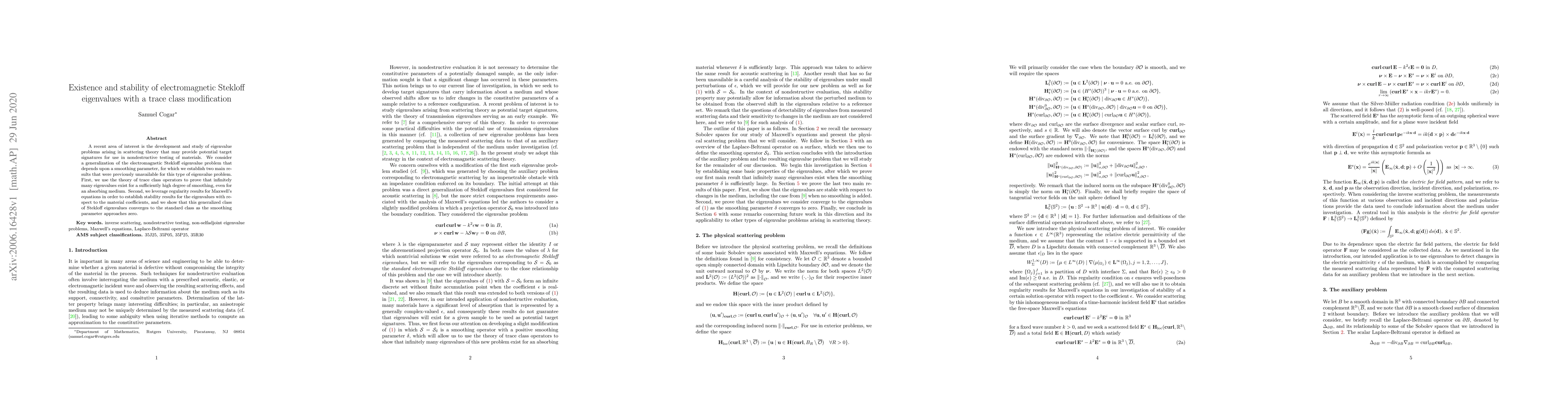 A recent area of interest is the development and study of eigenvalue problems arising in scattering theory that may provide potential target signatures for use in nondestructive testing of materials. We consider a generalization of the electromagnetic Stekloff eigenvalue problem that depends upon a smoothing parameter, for which we establish two main results that were previously unavailable for this type of eigenvalue problem. First, we use the theory of trace class operators to prove that infinitely many eigenvalues exist for a sufficiently high degree of smoothing, even for an absorbing medium. Second, we leverage regularity results for Maxwell's equations in order to establish stability results for the eigenvalues with respect to the material coefficients, and we show that this generalized class of Stekloff eigenvalues converges to the standard class as the smoothing parameter approaches zero.