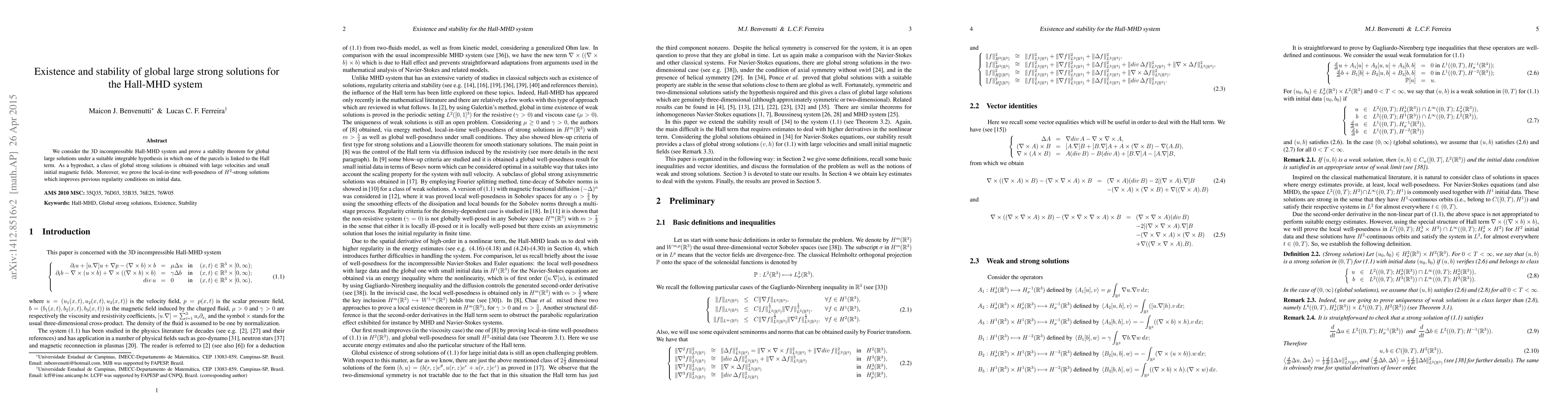 We consider the 3D incompressible Hall-MHD system and prove a stability theorem for global large solutions under a suitable integrable hypothesis in which one of the parcels is linked to the Hall term. As a byproduct, a class of global strong solutions is obtained with large velocities and small initial magnetic fields. Moreover, we prove the local-in-time well-posedness of $H^{2}$-strong solutions which improves previous regularity conditions on initial data.