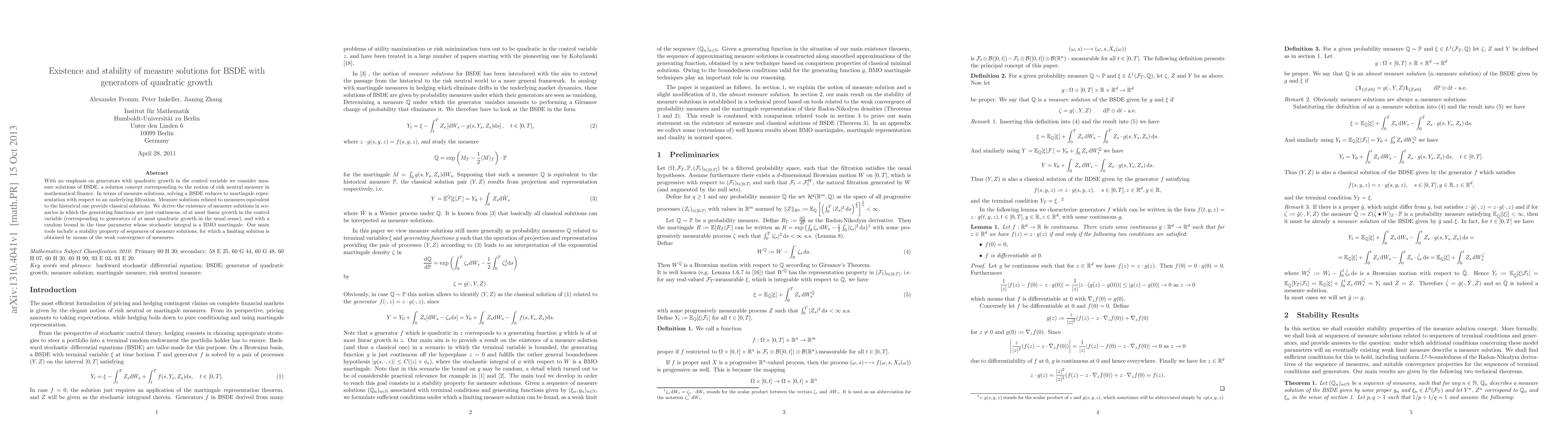 This paper explores the existence and stability of measure solutions for BSDEs with generators of quadratic growth, demonstrating their equivalence to classical solutions under certain conditions. The authors utilize stability properties and weak convergence of measures to derive the existence of solutions even when the generating functions exhibit only linear growth in the control variable.
