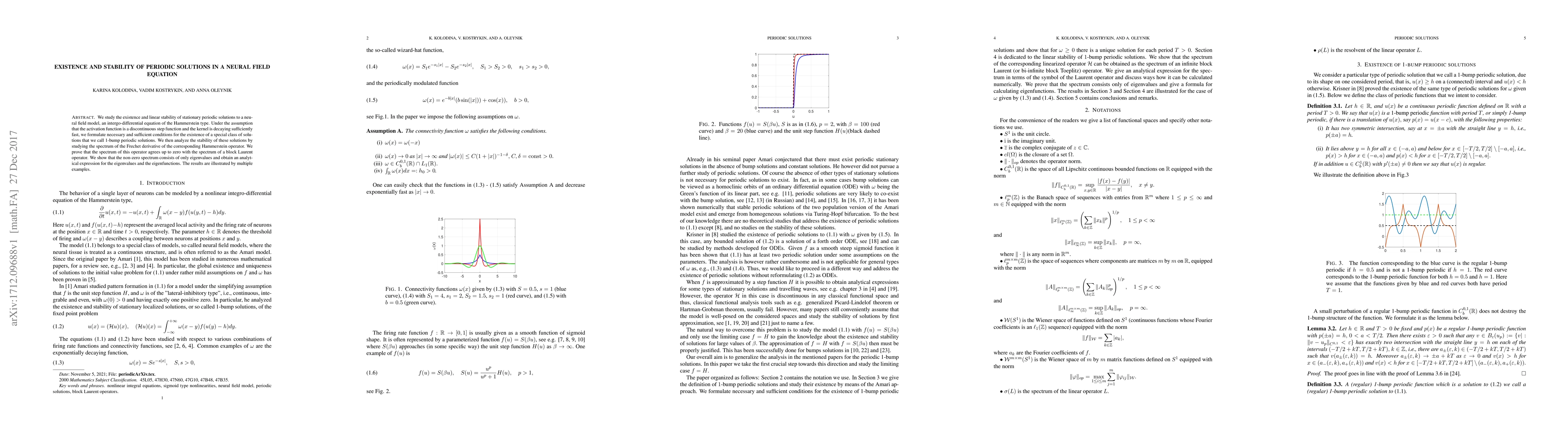 This paper investigates the existence and stability of periodic solutions in a neural field model, specifically focusing on 1-bump periodic solutions under a discontinuous step activation function. It establishes conditions for their existence and analyzes their stability through the spectrum of the Frechet derivative, revealing a connection to a block Laurent operator.