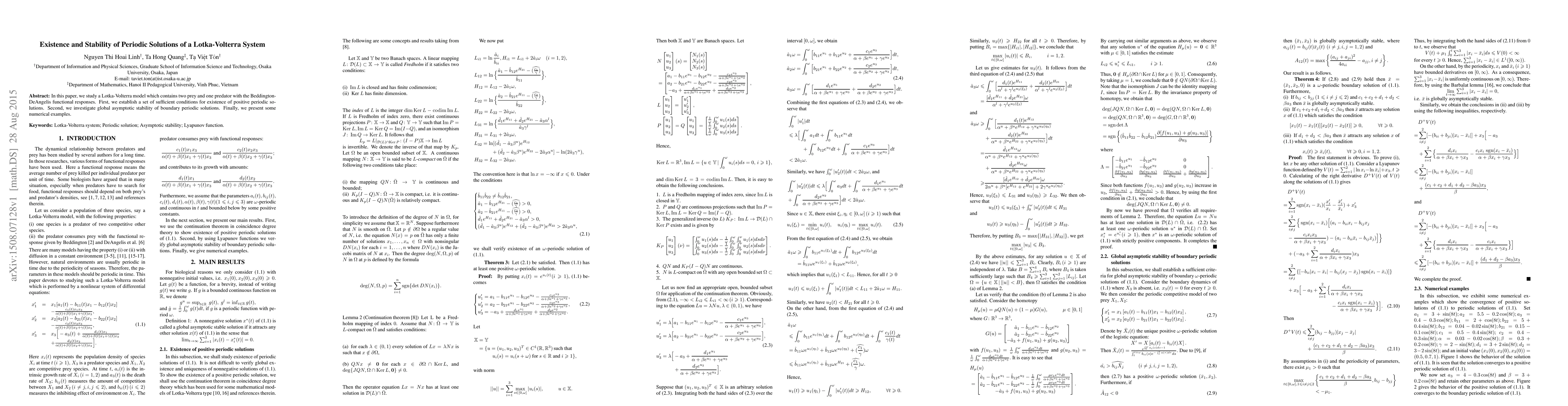 This paper investigates a Lotka-Volterra system with two prey and one predator using the Beddington-DeAngelis functional response, establishing conditions for the existence of positive periodic solutions and analyzing the global asymptotic stability of boundary periodic solutions, supplemented by numerical examples.