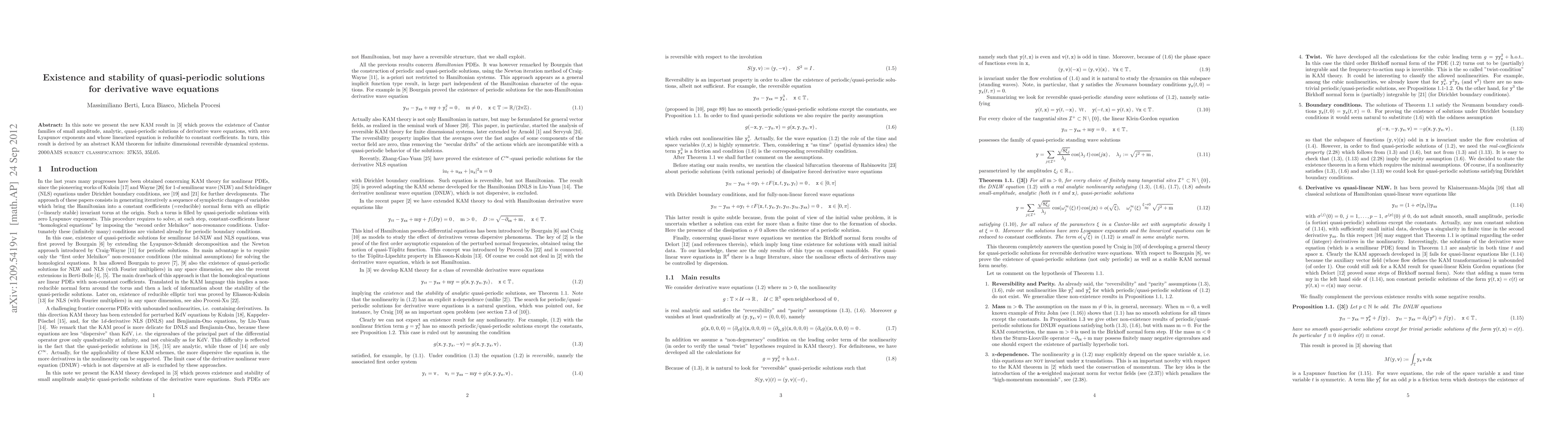 In this note we present a new KAM result which proves the existence of Cantor families of small amplitude, analytic, quasi-periodic solutions of derivative wave equations, with zero Lyapunov exponents and whose linearized equation is reducible to constant coefficients. In turn, this result is derived by an abstract KAM theorem for infinite dimensional reversible dynamical systems.