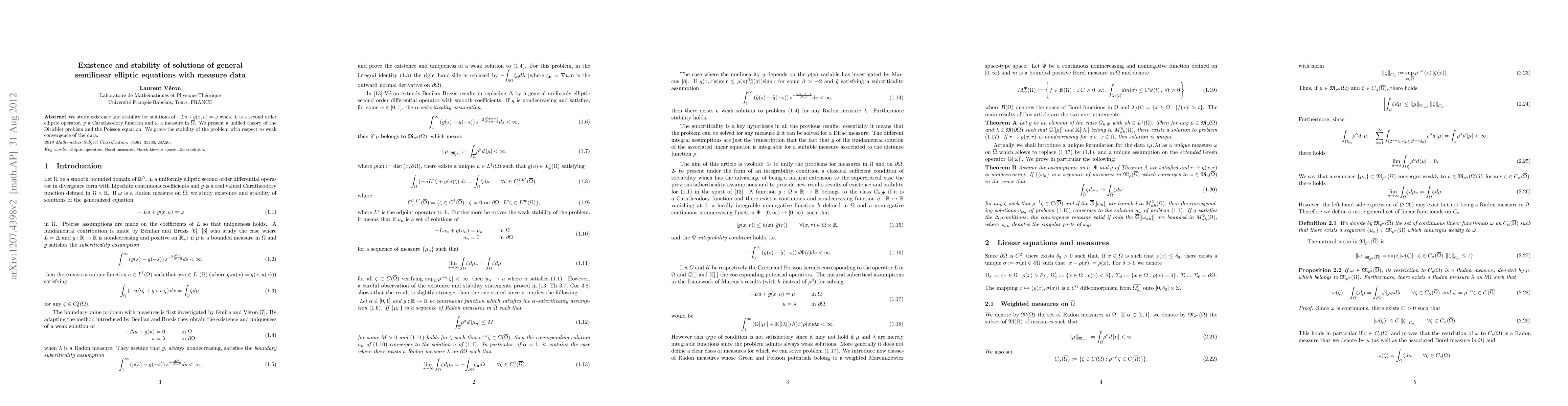 We study existence and stability for solutions of $Lu+g(x; u) = \omega$ in the closure of open set $\Omega$ where L is a second order elliptic operator, $g$ a Caratheodory function and $\omega$ a measure in $\bar\Omega$. We present a uni ed theory of the Dirichlet problem and the Poisson equation. We prove the stability of the problem with respect to weak convergence of the data.