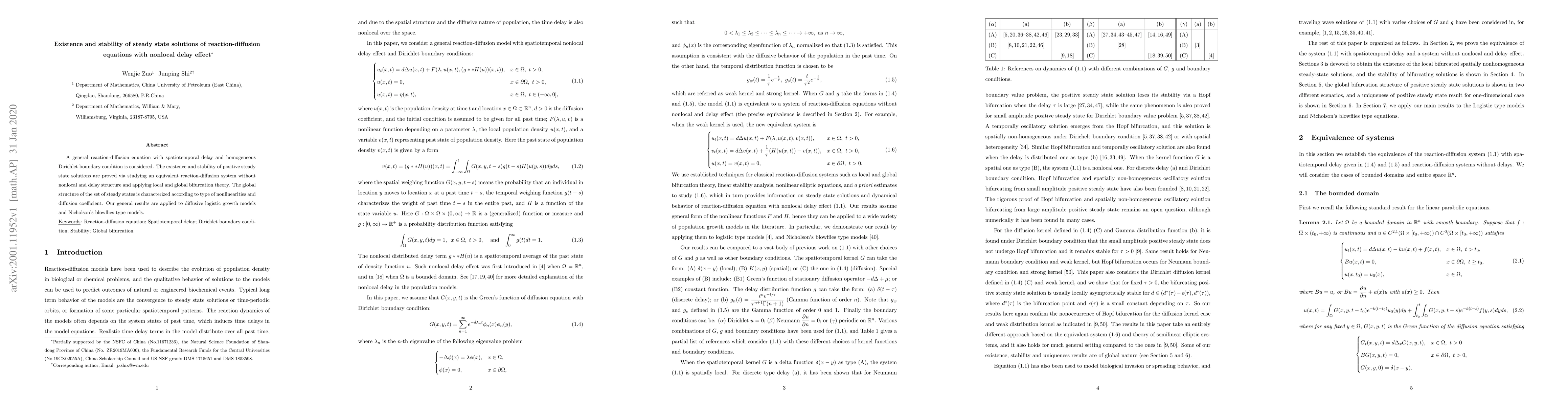A general reaction-diffusion equation with spatiotemporal delay and homogeneous Dirichlet boundary condition is considered. The existence and stability of positive steady state solutions are proved via studying an equivalent reaction-diffusion system without nonlocal and delay structure and applying local and global bifurcation theory. The global structure of the set of steady states is characterized according to type of nonlinearities and diffusion coefficient. Our general results are applied to diffusive logistic growth models and Nicholson's blowflies type models.