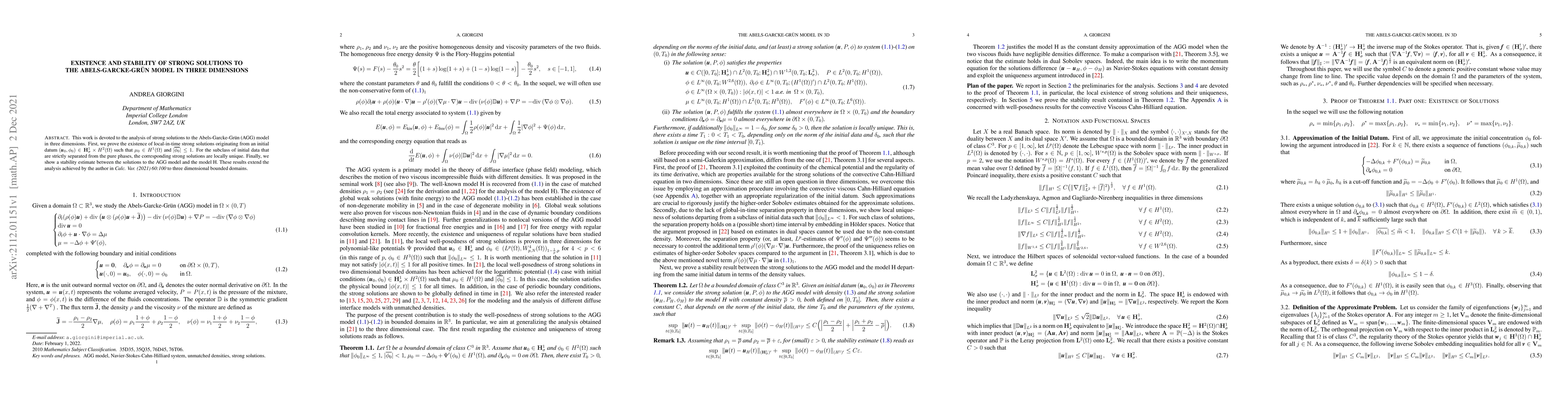 This research paper proves the existence and stability of strong solutions to the Abels-Garcke-Gr"{u}n model in three dimensions, extending previous analysis to three-dimensional bounded domains.