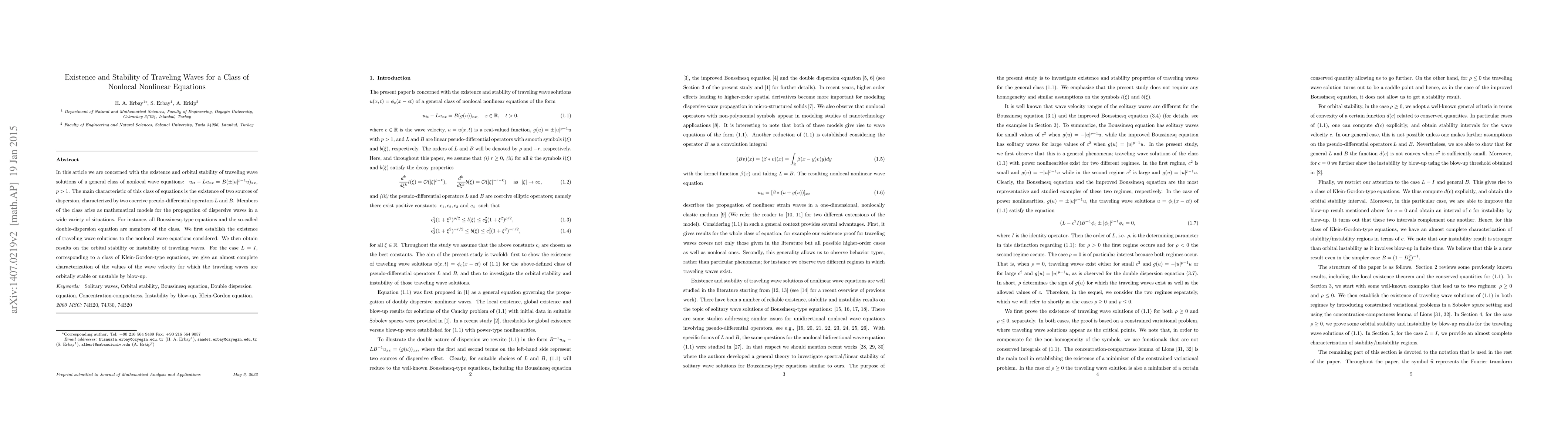 This paper investigates the existence and stability of traveling wave solutions for a class of nonlocal nonlinear wave equations featuring two sources of dispersion. It establishes the existence of such waves and analyzes their orbital stability, providing a comprehensive characterization for Klein-Gordon-type equations.