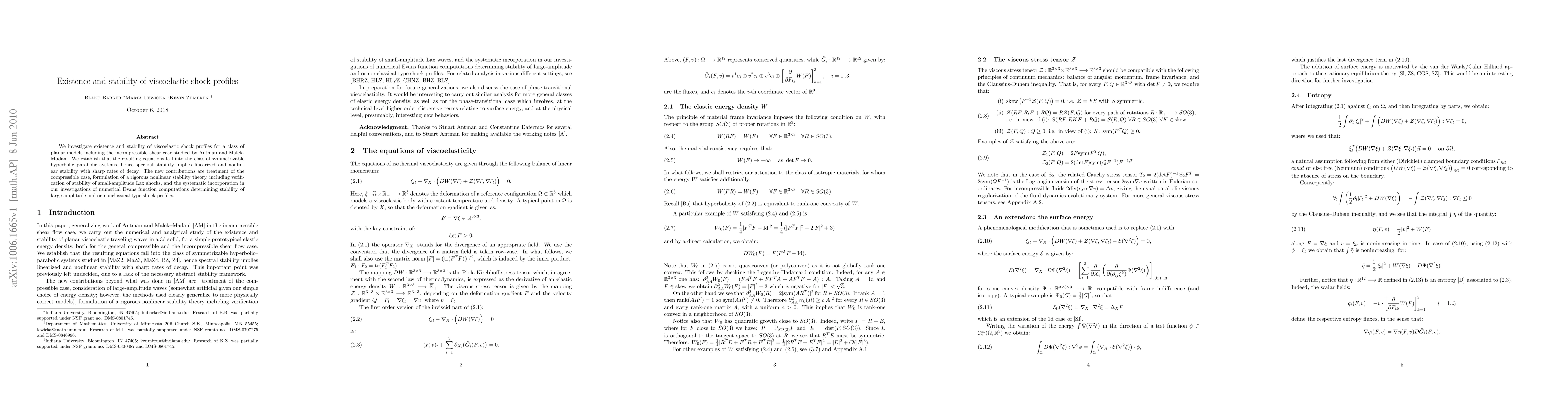 This paper investigates the existence and stability of viscoelastic shock profiles in planar models, establishing them as symmetrizable hyperbolic-parabolic systems. It presents a rigorous nonlinear stability theory, including stability for compressible cases and small-amplitude Lax shocks, verified through numerical Evans function computations.