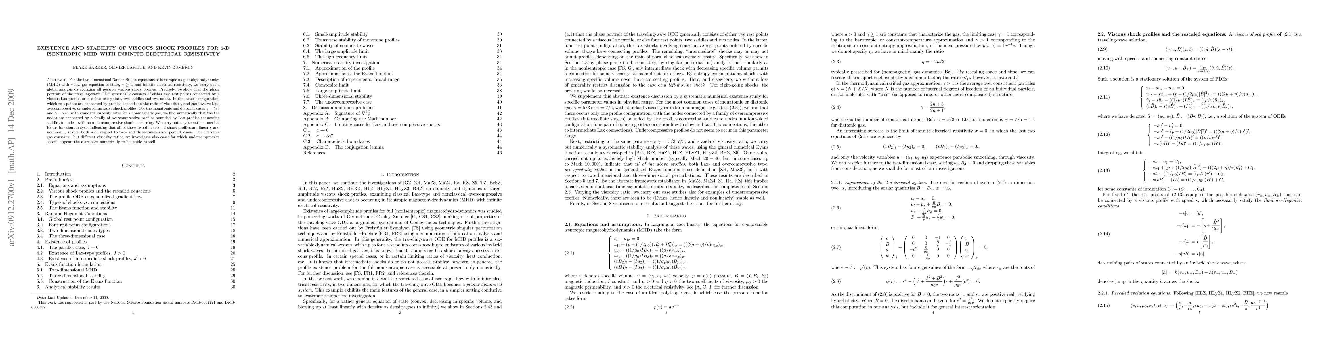For the two-dimensional Navier--Stokes equations of isentropic magnetohydrodynamics (MHD) with $\gamma$-law gas equation of state, $\gamma\ge 1$, and infinite electrical resistivity, we carry out a global analysis categorizing all possible viscous shock profiles. Precisely, we show that the phase portrait of the traveling-wave ODE generically consists of either two rest points connected by a viscous Lax profile, or else four rest points, two saddles and two nodes. In the latter configuration, which rest points are connected by profiles depends on the ratio of viscosities, and can involve Lax, overcompressive, or undercompressive shock profiles. For the monatomic and diatomic cases $\gamma=5/3$ and $\gamma= 7/5$, with standard viscosity ratio for a nonmagnetic gas, we find numerically that the the nodes are connected by a family of overcompressive profiles bounded by Lax profiles connecting saddles to nodes, with no undercompressive shocks occurring. We carry out a systematic numerical Evans function analysis indicating that all of these two-dimensional shock profiles are linearly and nonlinearly stable, both with respect to two- and three-dimensional perturbations. For the same gas constants, but different viscosity ratios, we investigate also cases for which undercompressive shocks appear; these are seen numerically to be stable as well
