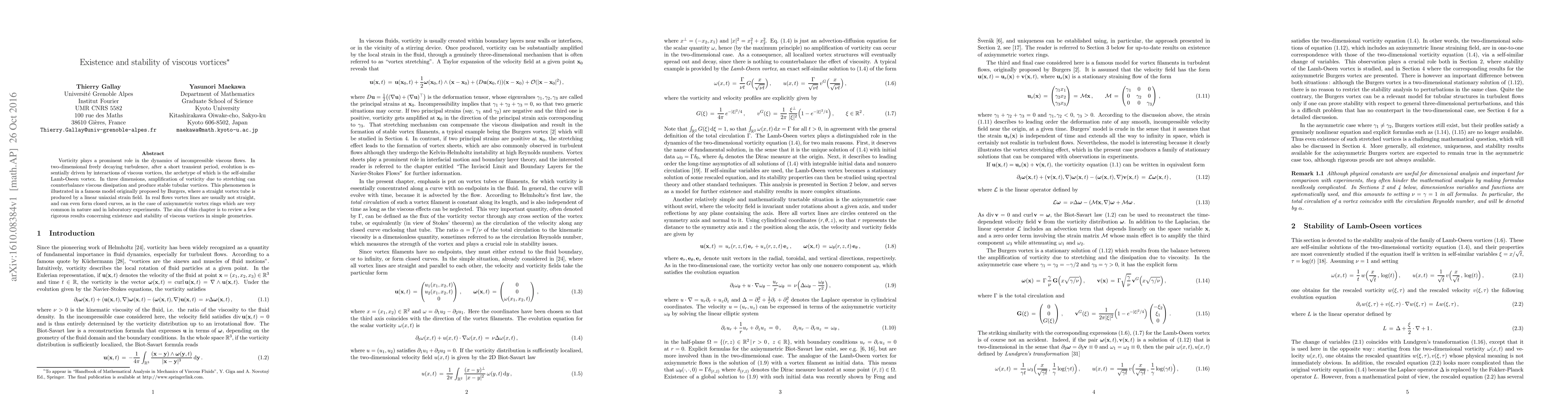 Vorticity plays a prominent role in the dynamics of incompressible viscous flows. In two-dimensional freely decaying turbulence, after a short transient period, evolution is essentially driven by interactions of viscous vortices, the archetype of which is the self-similar Lamb-Oseen vortex. In three dimensions, amplification of vorticity due to stretching can counterbalance viscous dissipation and produce stable tubular vortices. This phenomenon is illustrated in a famous model originally proposed by Burgers, where a straight vortex tube is produced by a linear uniaxial strain field. In real flows vortex lines are usually not straight, and can even form closed curves, as in the case of axisymmetric vortex rings which are very common in nature and in laboratory experiments. The aim of this chapter is to review a few rigorous results concerning existence and stability of viscous vortices in simple geometries.