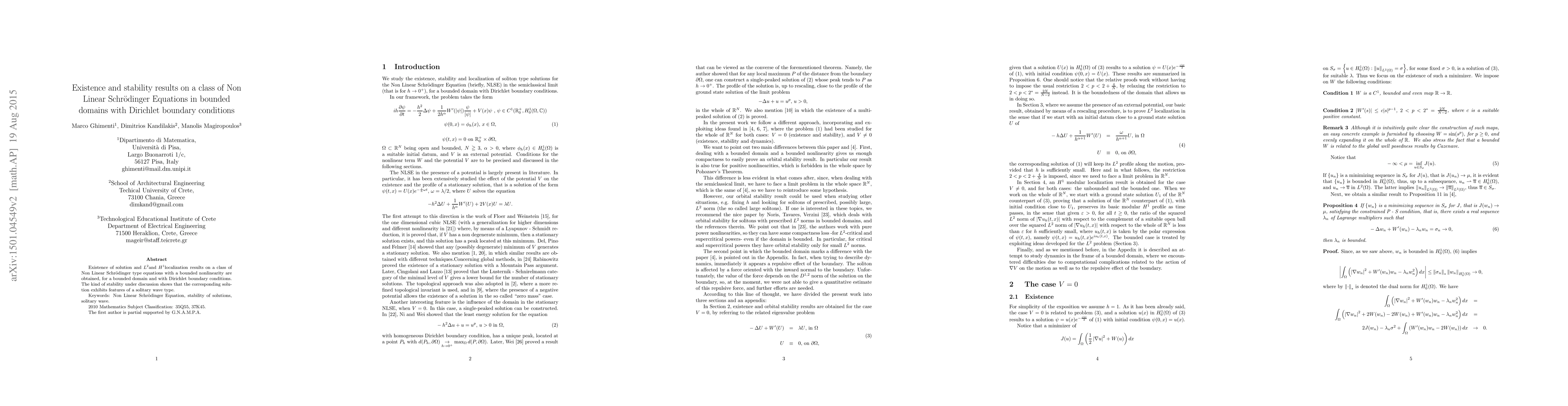 This paper proves existence and stability results for a type of nonlinear Schroedinger equation with Dirichlet boundary conditions in bounded domains, revealing solitary wave-like properties in the solution.