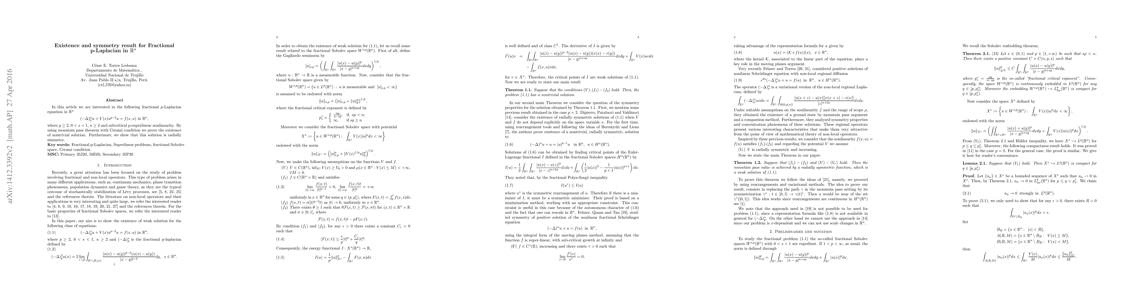 This paper investigates the existence and symmetry of solutions for the fractional $p$-Laplacian equation in $\mathbb{R}^n$, proving nontrivial solutions via the mountain pass theorem and demonstrating radial symmetry for these solutions.