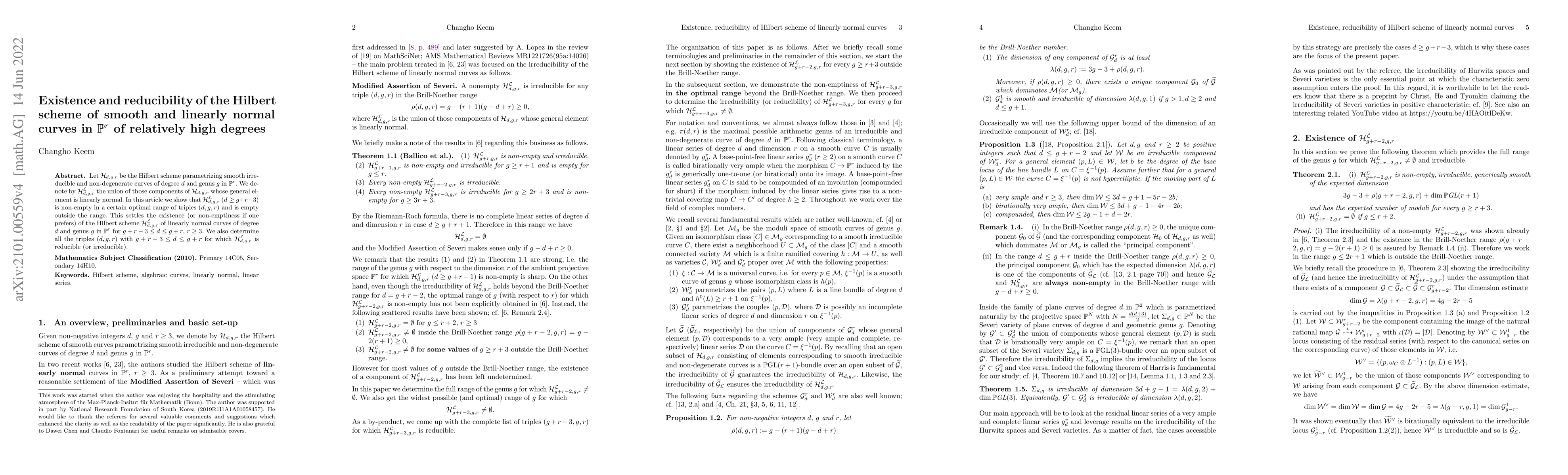 This paper establishes the existence and reducibility of the Hilbert scheme $\mathcal{H}^\mathcal{L}_{d,g,r}$ for linearly normal curves in $\mathbb{P}^r$, showing it is non-empty within a specific optimal range of $(d,g,r)$ and empty otherwise, while also determining when it is reducible or irreducible.