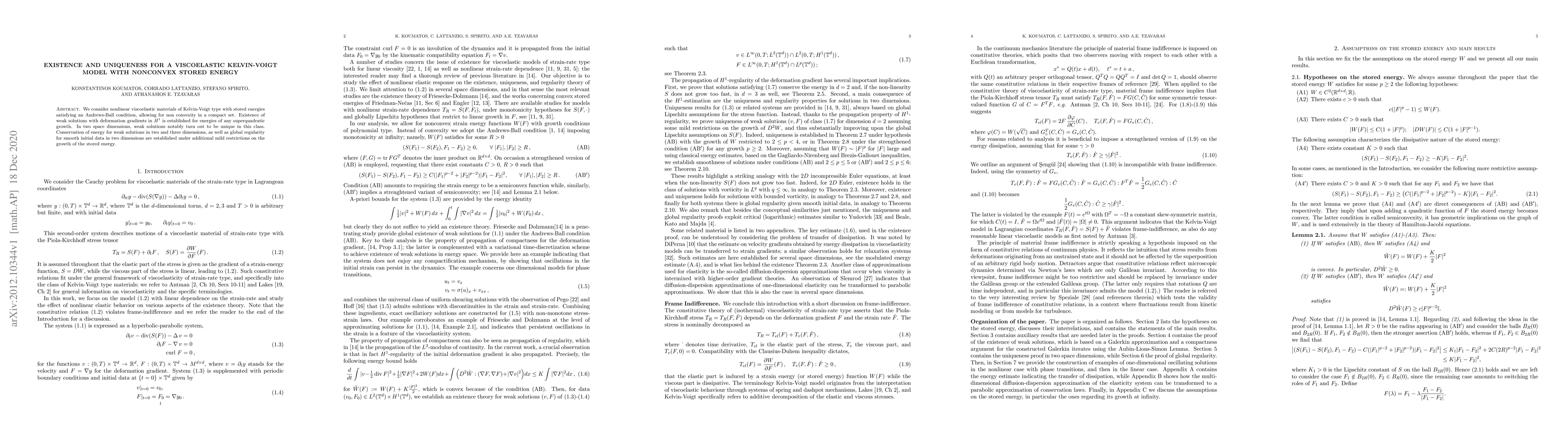 The work presents novel results on the existence and uniqueness of weak solutions for a viscoelastic model with nonconvex stored energy, extending previous findings to a broader class of materials and dimensions, and providing detailed energy conservation and regularity estimates.