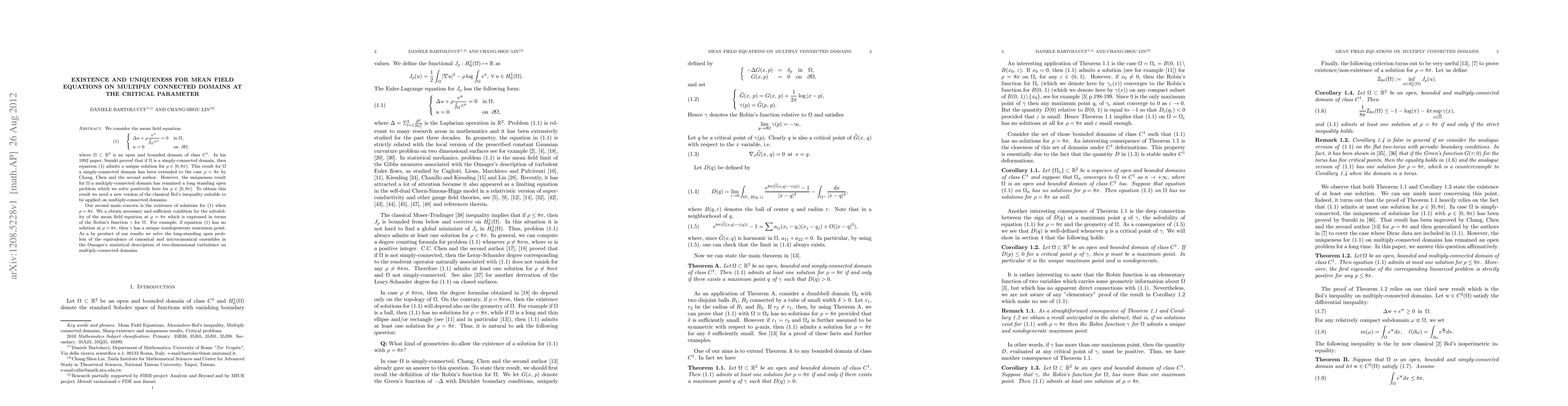 We consider the mean field equation: (1) \Delta u+\rho\frac{e^u}{\int_\Omega e^u}=0 & \hbox{in} \;\Omega, u=0 & \hbox{on}\;\partial\Omega, where $\Omega\subset \mathbb{R}^2$ is an open and bounded domain of class $C^1$. In his 1992 paper, Suzuki proved that if $\Omega$ is a simply-connected domain, then equation (1) admits a unique solution for $\rho\in[0,8\pi)$. This result for $\Omega$ a simply-connected domain has been extended to the case $\rho=8\pi$ by Chang, Chen and the second author. However, the uniqueness result for $\Omega$ a multiply-connected domain has remained a long standing open problem which we solve positively here for $\rho\in[0,8\pi]$. To obtain this result we need a new version of the classical Bol's inequality suitable to be applied on multiply-connected domains. Our second main concern is the existence of solutions for (1) when $\rho=8\pi$. We a obtain necessary and sufficient condition for the solvability of the mean field equation at $\rho=8\pi$ which is expressed in terms of the Robin's function $\gamma$ for $\Omega$. For example, if equation (1) has no solution at $\rho=8\pi$, then $\gamma$ has a unique nondegenerate maximum point. As a by product of our results we solve the long-standing open problem of the equivalence of canonical and microcanonical ensembles in the Onsager's statistical description of two-dimensional turbulence on multiply-connected domains.