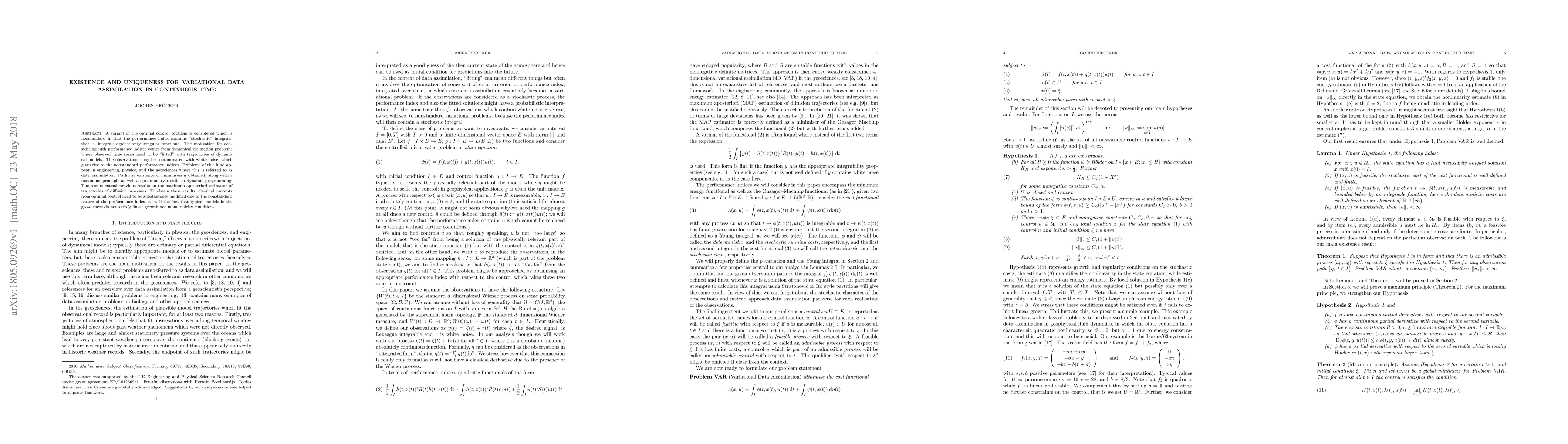 A variant of the optimal control problem is considered which is nonstandard in that the performance index contains "stochastic" integrals, that is, integrals against very irregular functions. The motivation for considering such performance indices comes from dynamical estimation problems where observed time series need to be "fitted" with trajectories of dynamical models. The observations may be contaminated with white noise, which gives rise to the nonstandard performance indices. Problems of this kind appear in engineering, physics, and the geosciences where this is referred to as data assimilation. Pathwise existence of minimisers is obtained, along with a maximum principle as well as preliminary results in dynamic programming. The results extend previous results on the maximum aposteriori estimator of trajectories of diffusion processes. To obtain these results, classical concepts from optimal control need to be substantially modified due to the nonstandard nature of the performance index, as well the fact that typical models in the geosciences do not satisfy linear growth nor monotonicity conditions.