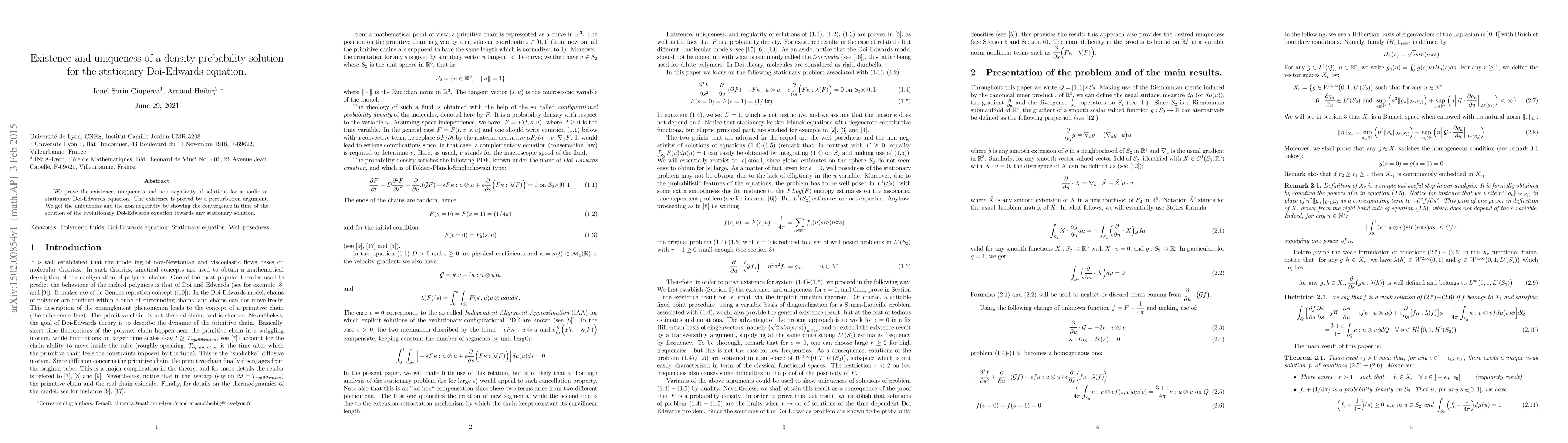 This paper proves the existence, uniqueness, and non-negativity of solutions for the stationary Doi-Edwards equation using a perturbation argument and demonstrates the convergence of evolutionary solutions to stationary solutions.