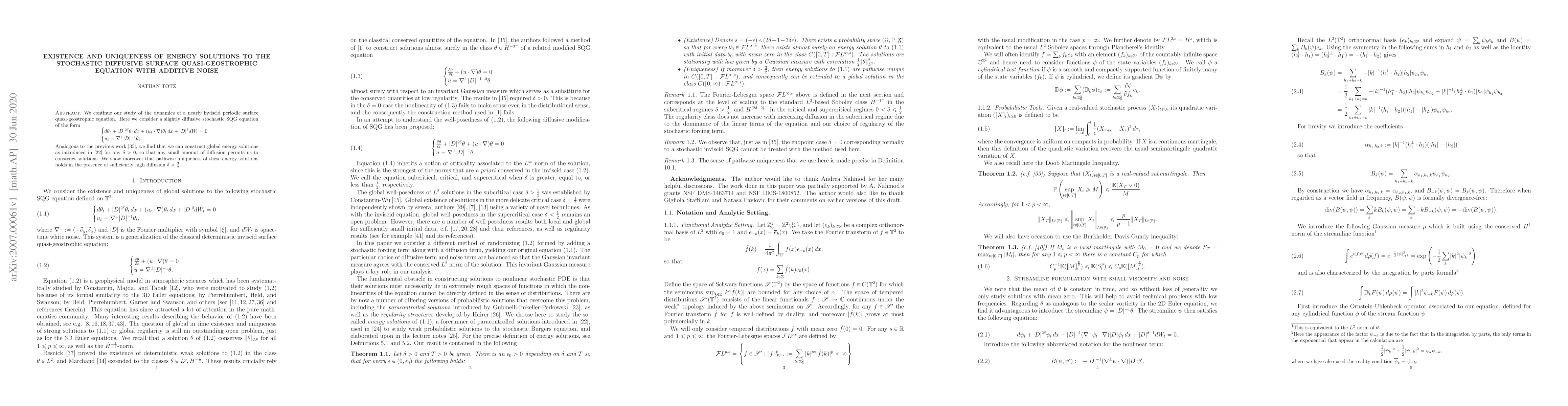 We continue our study of the dynamics of a nearly inviscid periodic surface quasi-geostrophic equation. Here we consider a slightly diffusive stochastic SQG equation of the form \begin{equation*} \begin{cases} d\theta_t + |D|^{2\delta}\theta_t\,dx + (u_t \cdot \nabla)\theta_t\,dx + |D|^{\delta}dW_t = 0 \\ u_t = \nabla^\perp|D|^{-1}\theta_t. \end{cases} \end{equation*} We construct global energy solutions as introduced by P. Goncalves and M. Jara (2014) for any $\delta > 0$, so that any small amount of diffusion permits us to construct solutions. We show moreover that pathwise uniqueness of these energy solutions holds in the presence of sufficiently high diffusion $\delta > \frac32$.