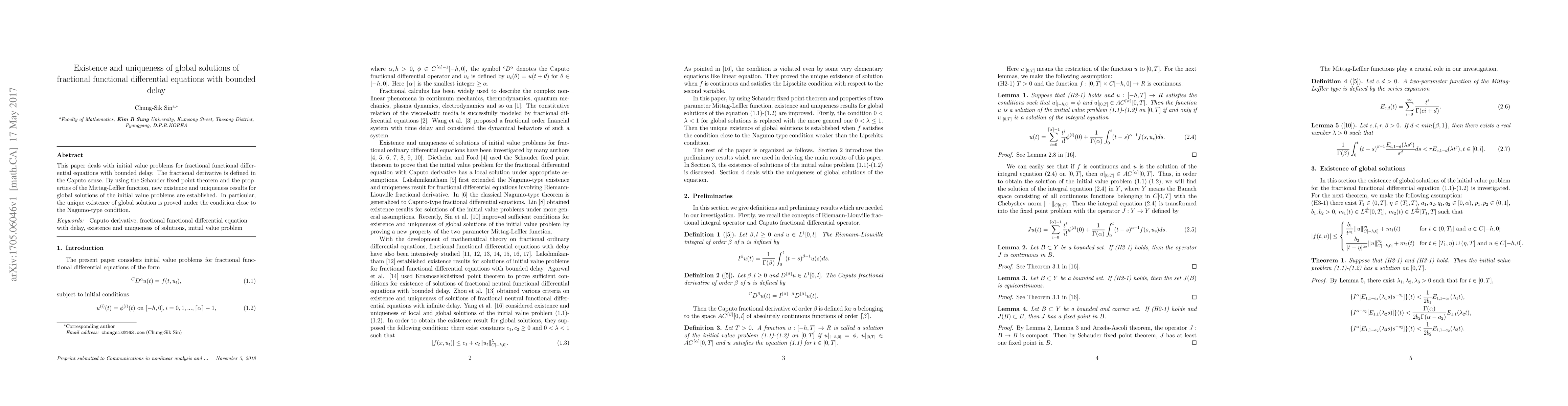 This paper establishes existence and uniqueness results for global solutions of fractional functional differential equations with bounded delay using the Schauder fixed point theorem and properties of the Mittag-Leffler function, proving the unique existence under a condition similar to the Nagumo-type condition.