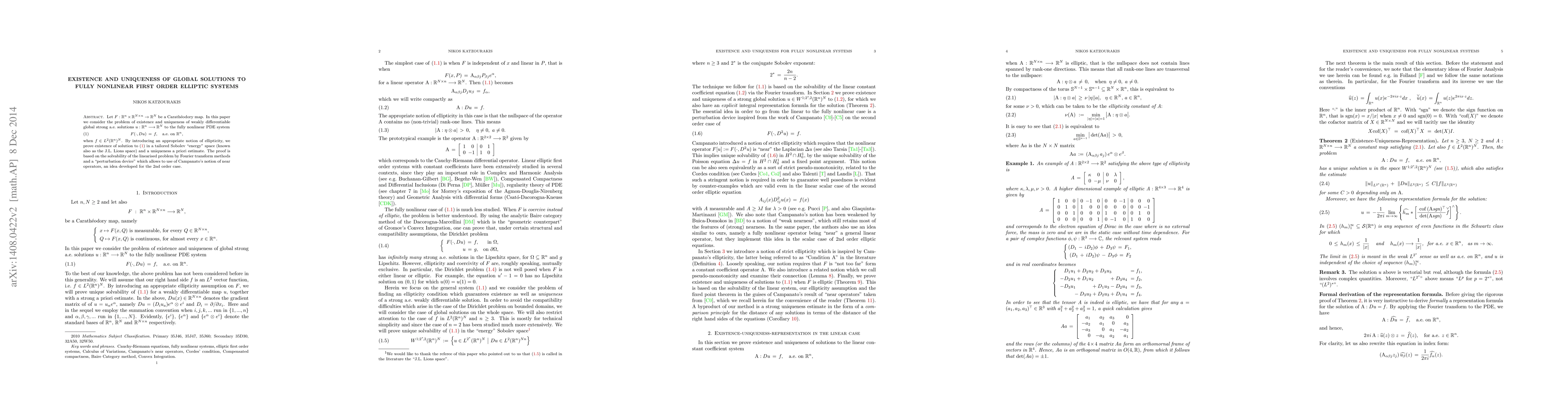 Let $F : \mathbb{R}^n \times \mathbb{R}^{N\times n} \rightarrow \mathbb{R}^N$ be a Caratheodory map. In this paper we consider the problem of existence and uniqueness of weakly differentiable global strong a.e. solutions $u: \mathbb{R}^n \longrightarrow \mathbb{R}^N$ to the fully nonlinear PDE system \[\label{1} \tag{1} F(\cdot,Du ) \,=\, f, \ \ \text{ a.e. on }\mathbb{R}^n, \] when $ f\in L^2(\mathbb{R}^n)^N$. This problem has not been considered before. By introducing an appropriate notion of ellipticity, we prove existence of solution to \eqref{1} in a tailored Sobolev "energy" space (known also as the J.L. Lions space) and a uniqueness a priori estimate. The proof is based on the solvability of the linearised problem by Fourier transform methods and a "perturbation device" which allows to use of Campanato's notion of near operators, an idea developed for the 2nd order case.