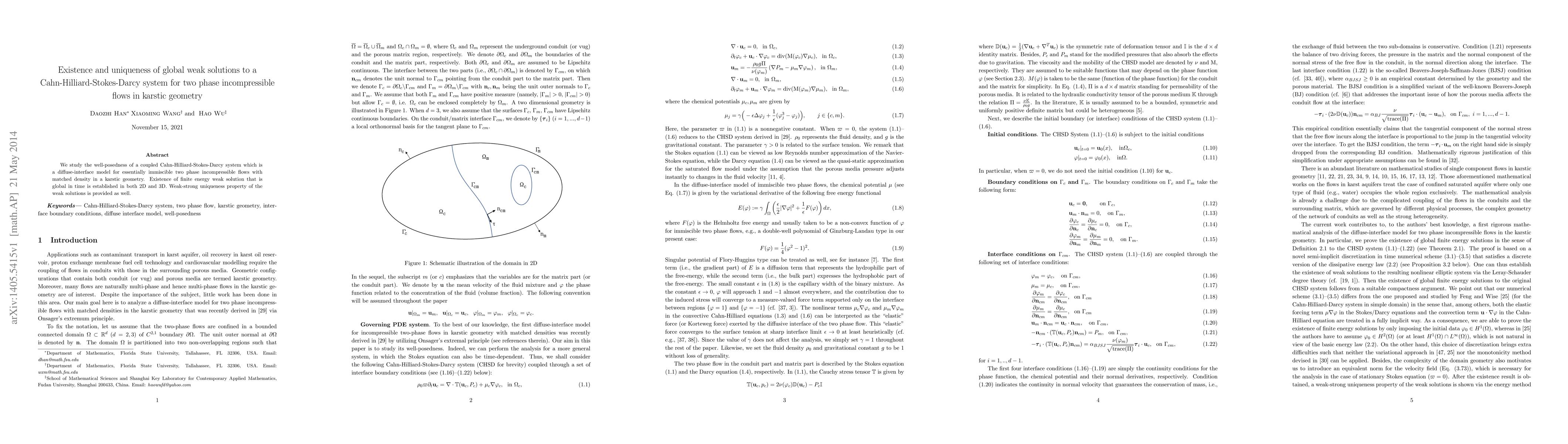 This paper establishes the existence and uniqueness of global weak solutions for a coupled Cahn-Hilliard-Stokes-Darcy system modeling two-phase incompressible flows in karstic geometry. It also provides a weak-strong uniqueness property for these solutions in both 2D and 3D settings.