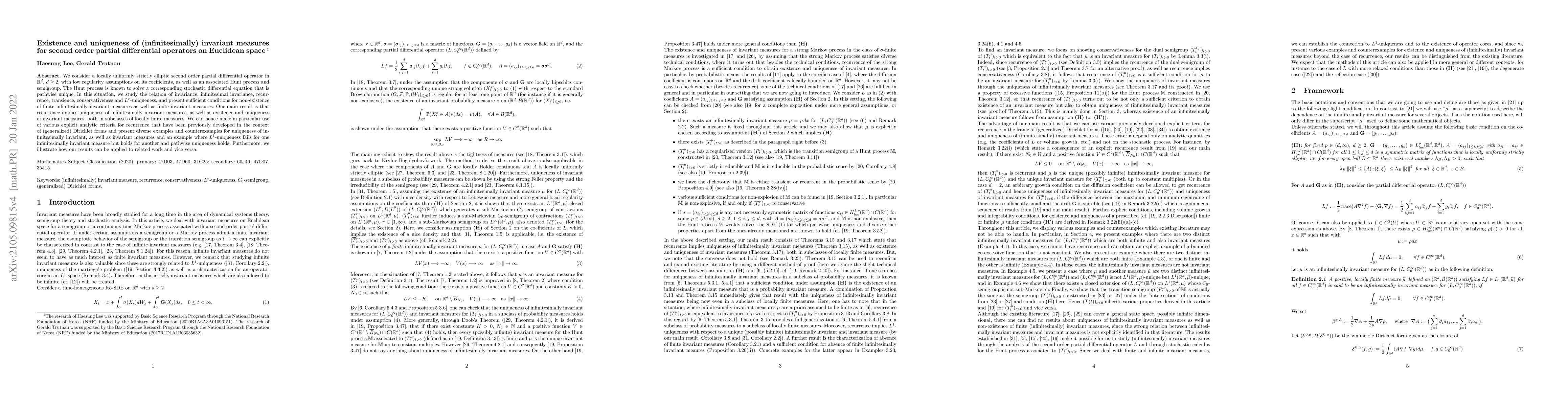 This paper studies the existence and uniqueness of invariant measures for second-order partial differential operators on Euclidean space, finding that recurrence implies both infinitesimal invariance and L^r-uniqueness.