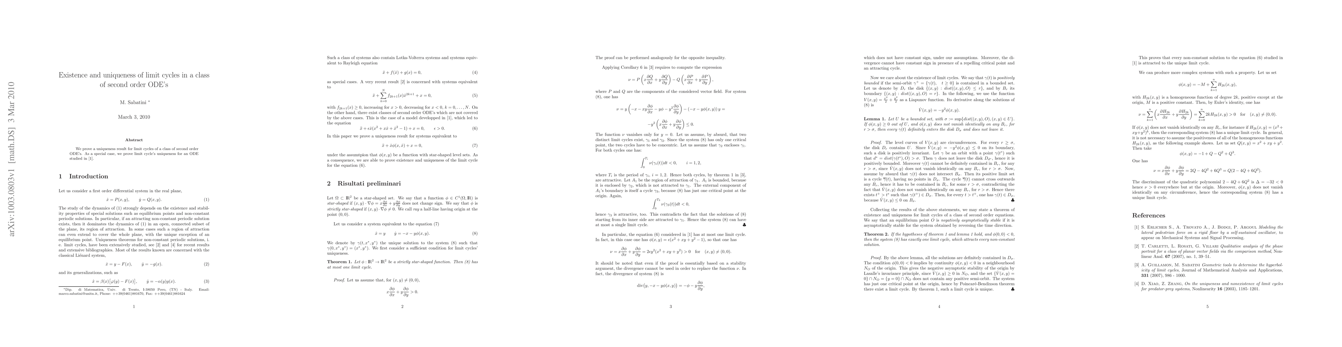 We prove a uniqueness result for limit cycles of a class of second order ODE's. As a special case, we prove limit cycle's uniqueness for an ODE studied in \cite{ETBA}.