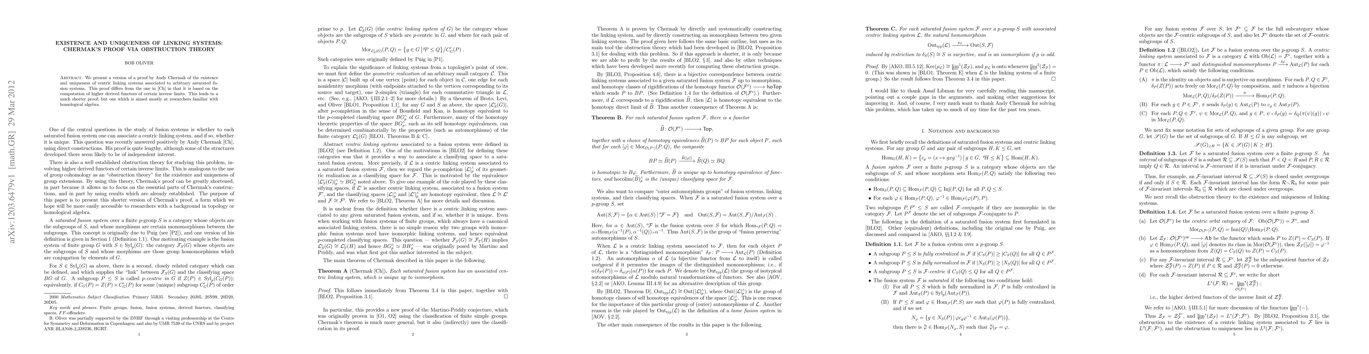 Summary: This paper presents a concise proof by Andy Chermak for the existence and uniqueness of centric linking systems in saturated fusion systems, utilizing obstruction theory and higher derived functors, aimed at those with a background in homological algebra.