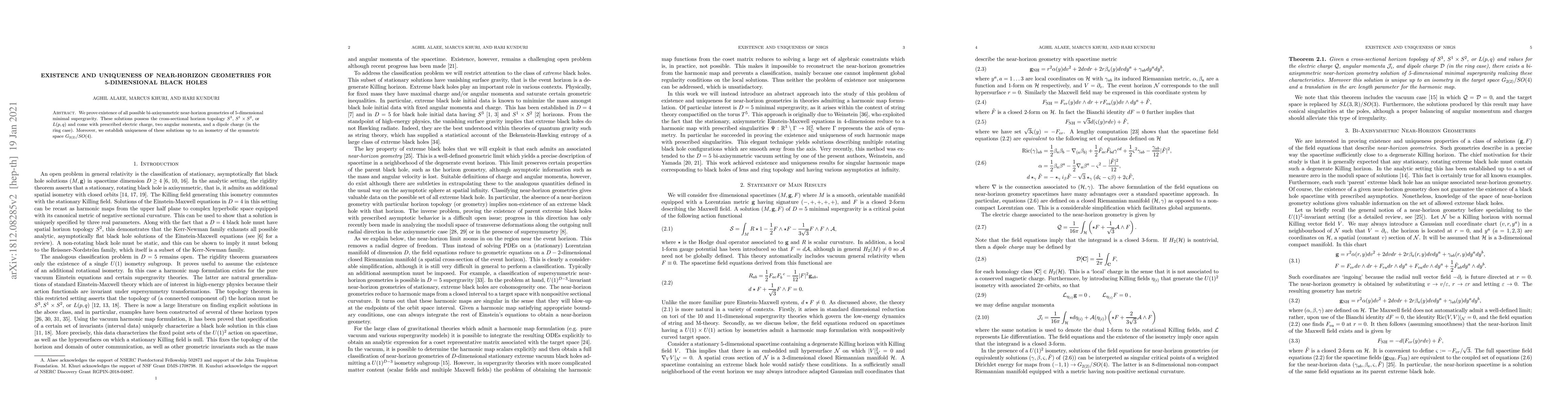 We prove existence of all possible bi-axisymmetric near-horizon geometries of 5-dimensional minimal supergravity. These solutions possess the cross-sectional horizon topology $S^3$, $S^1\times S^2$, or $L(p,q)$ and come with prescribed electric charge, two angular momenta, and a dipole charge (in the ring case). Moreover, we establish uniqueness of these solutions up to an isometry of the symmetric space $G_{2(2)}/SO(4)$.