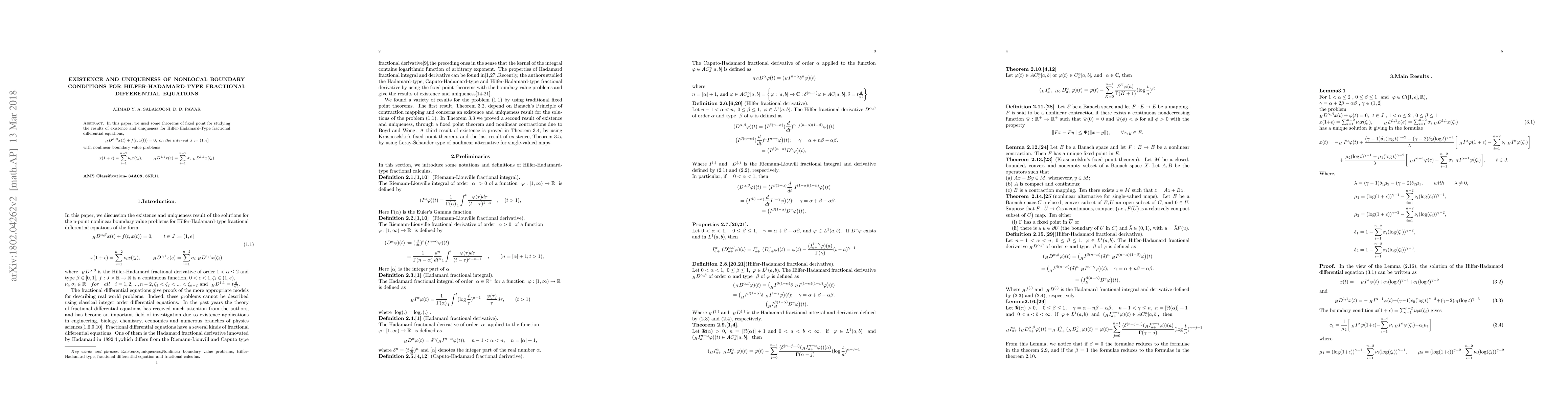 This paper investigates the existence and uniqueness of solutions for Hilfer-Hadamard-type fractional differential equations using fixed point theorems. It focuses on the interval \(J:=(1,e)\) with specific nonlocal boundary conditions involving sums of function values at different points.