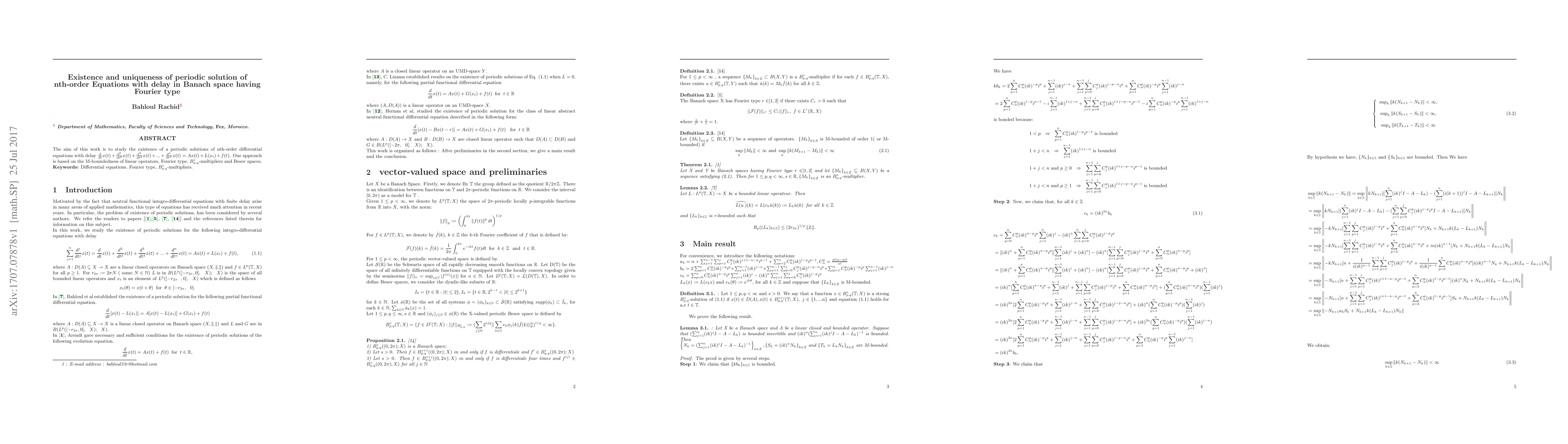 The aim of this work is to study the existence of a periodic solutions of nth-order differential equations with delay d dt x(t) + d 2 dt 2 x(t) + d 3 dt 3 x(t) + ... + d n dt n x(t) = Ax(t) + L(xt) + f (t). Our approach is based on the M-boundedness of linear operators, Fourier type, B s p,q-multipliers and Besov spaces.