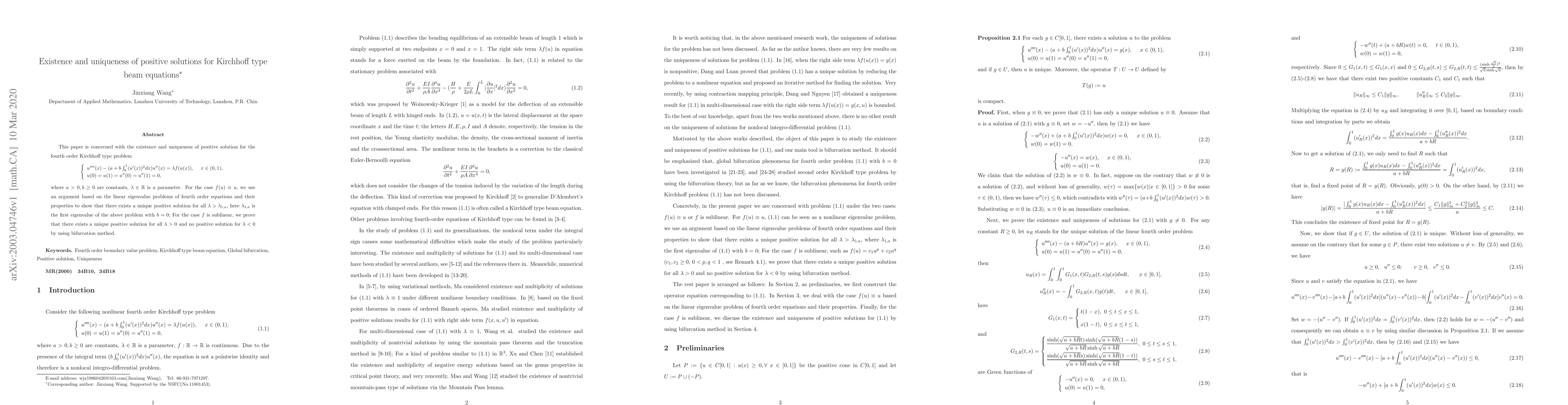 This paper investigates the existence and uniqueness of positive solutions for a fourth-order Kirchhoff type beam equation with specific boundary conditions, proving existence for certain values of lambda and uniqueness under specific conditions.