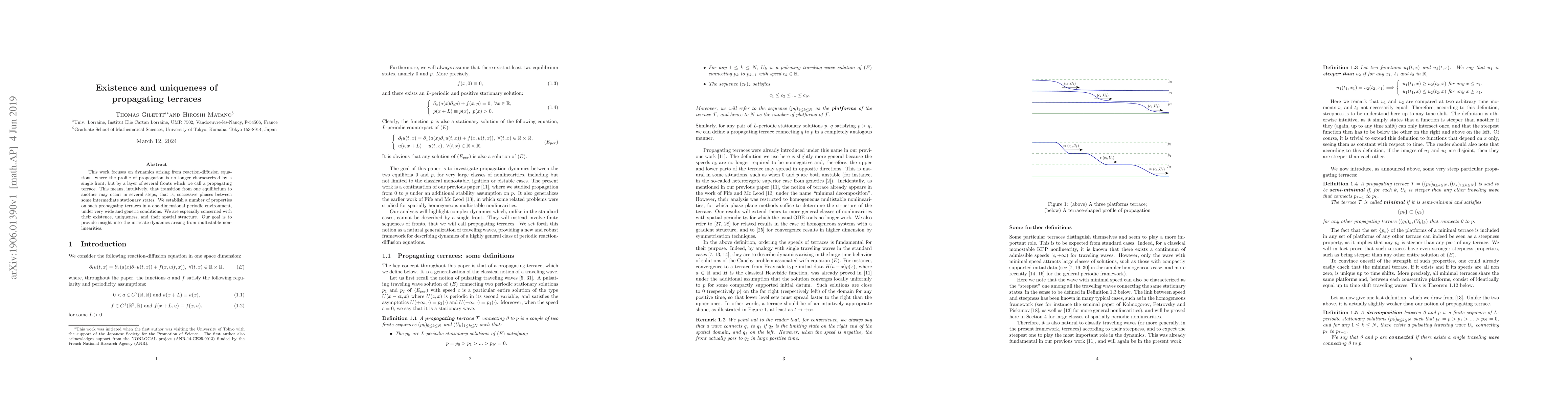 This work focuses on dynamics arising from reaction-diffusion equations , where the profile of propagation is no longer characterized by a single front, but by a layer of several fronts which we call a propagating terrace. This means, intuitively, that transition from one equilibrium to another may occur in several steps, that is, successive phases between some intermediate stationary states. We establish a number of properties on such propagating terraces in a one-dimensional periodic environment, under very wide and generic conditions. We are especially concerned with their existence, uniqueness, and their spatial structure. Our goal is to provide insight into the intricate dynamics arising from multistable non-linearities.