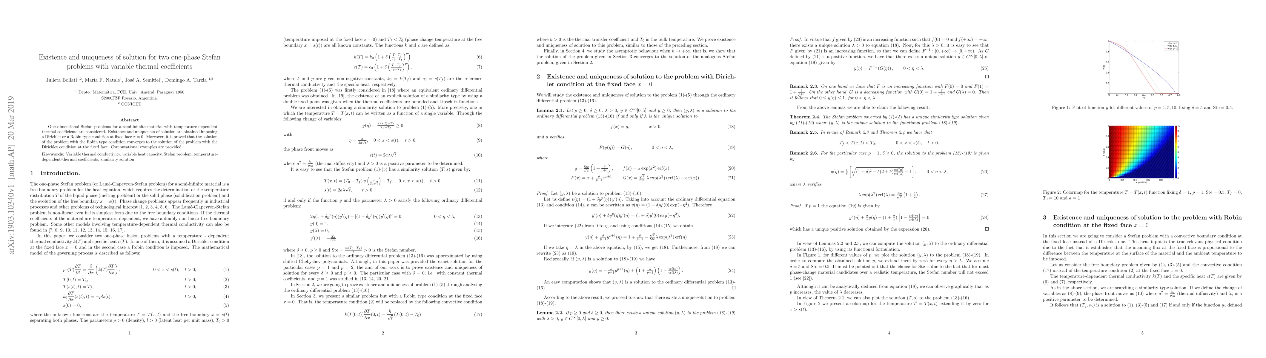 This paper investigates the existence and uniqueness of solutions for one-dimensional Stefan problems involving semi-infinite materials with temperature-dependent thermal coefficients. It demonstrates that solutions exist and are unique under Dirichlet or Robin boundary conditions at x=0, and proves convergence of the Robin solution to the Dirichlet solution.