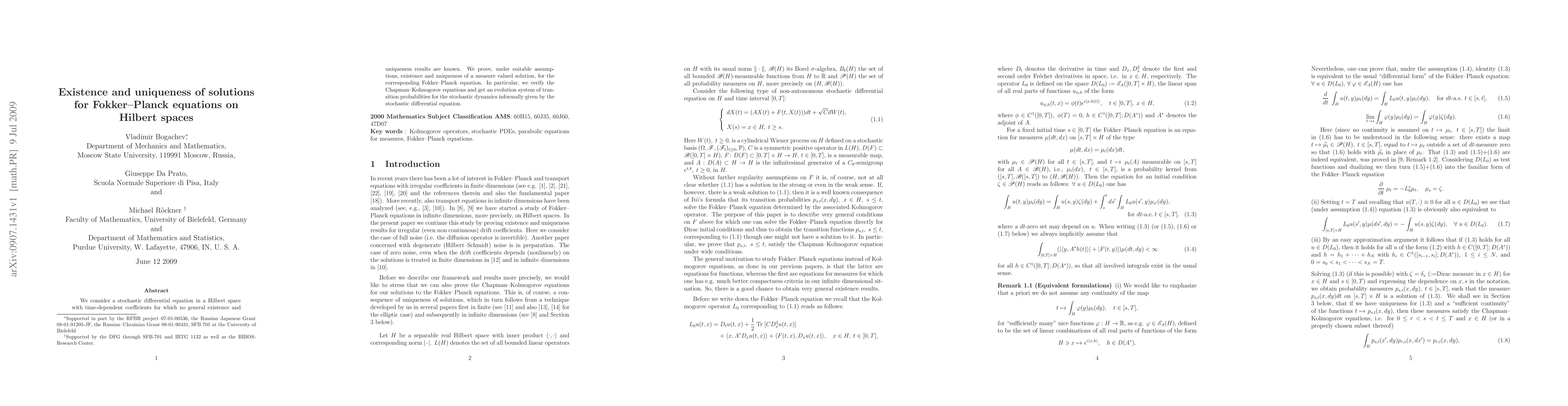 This paper proves existence and uniqueness of measure-valued solutions for Fokker-Planck equations in Hilbert spaces, addressing a gap where no general results previously existed. The study verifies the Chapman-Kolmogorov equations and provides an evolution system for transition probabilities of the associated stochastic dynamics.