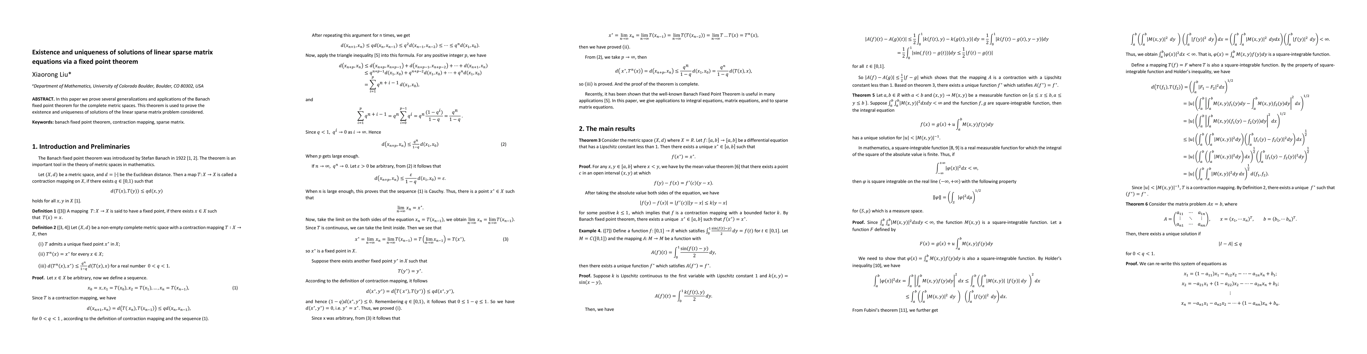 In this paper, we prove several generalizations and applications of a fixed point theorem. This theorem is used to prove the existence and uniqueness of solutions of the linear sparse matrix problem considered.