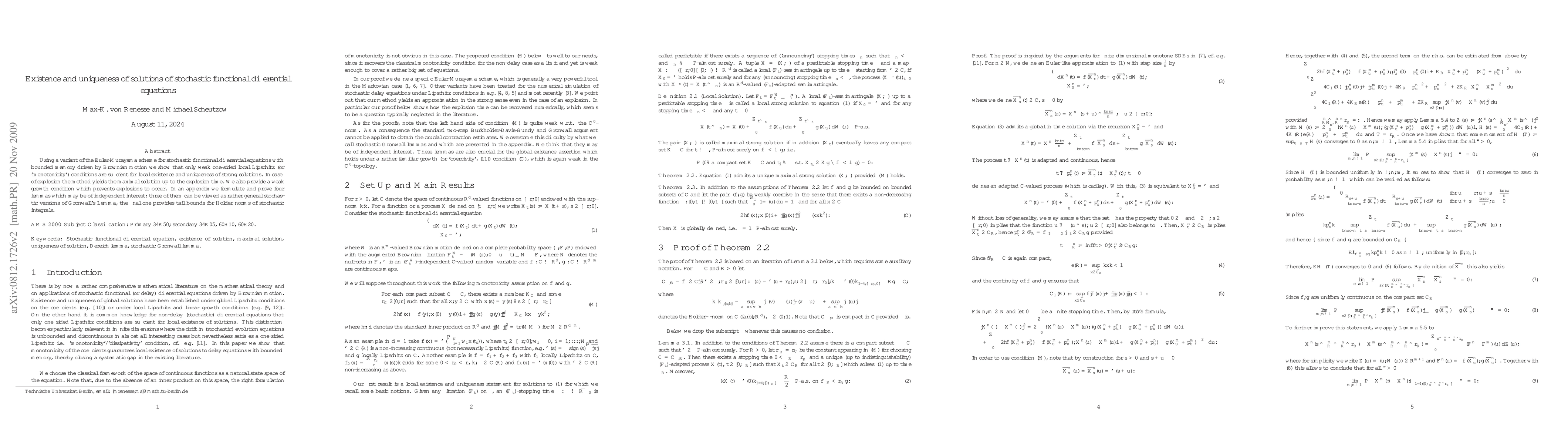 This paper establishes sufficient conditions for the existence and uniqueness of solutions to stochastic functional differential equations driven by Brownian motion. It extends prior results by requiring only continuous coefficients and a one-sided local Lipschitz condition for local existence and uniqueness. An appendix includes four lemmas, including stochastic versions of Gronwall's Lemma and a Dereich-Lemma for tail bounds on stochastic integrals.