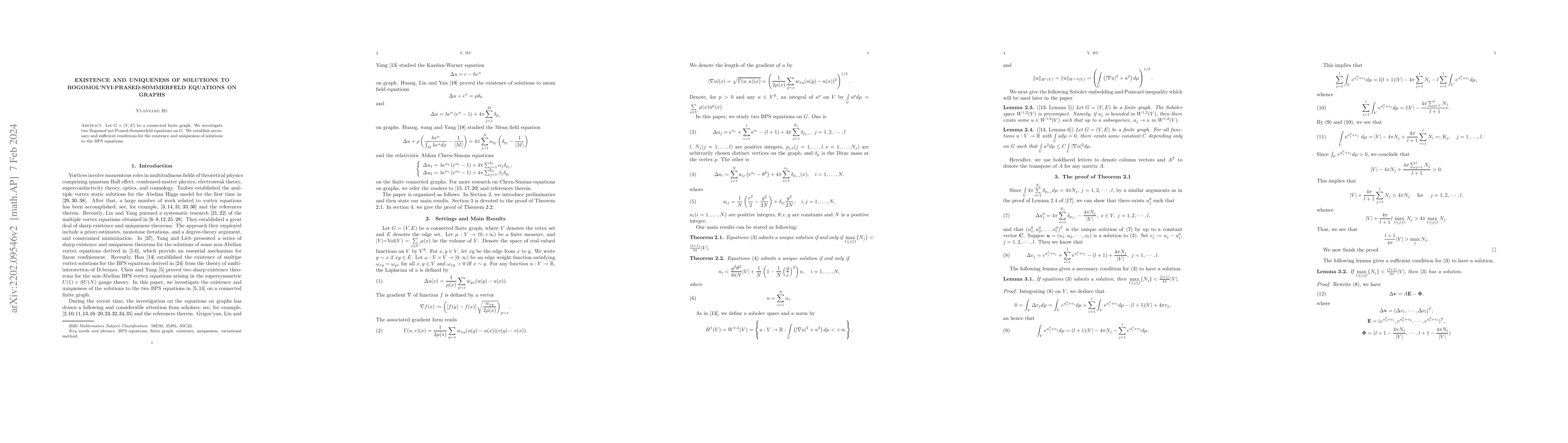 This paper investigates the existence and uniqueness of solutions to two Bogomol'nyi-Prased-Sommerfeld (BPS) equations on a connected finite graph $G=(V,E)$. It establishes necessary and sufficient conditions for the solutions to these equations.