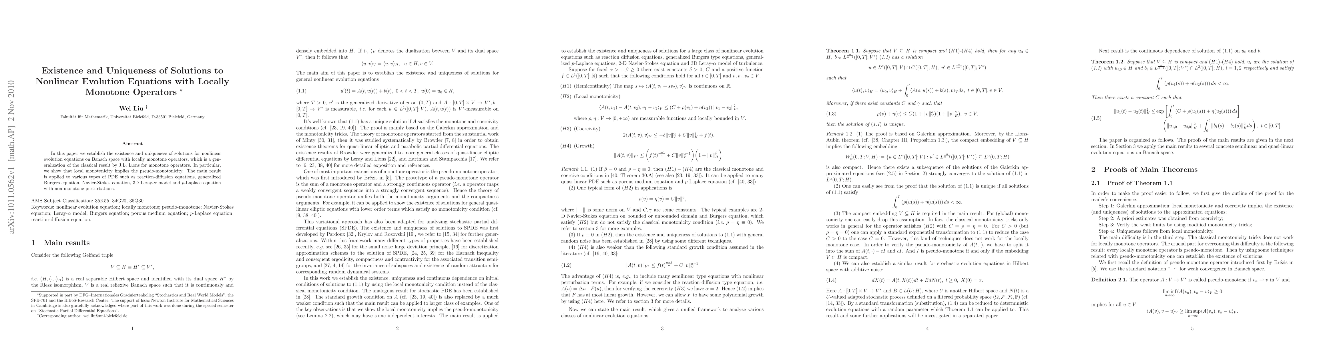 This paper proves the existence and uniqueness of solutions for nonlinear evolution equations on Banach spaces using locally monotone operators, extending classical results by J.L. Lions. It also demonstrates that local monotonicity implies pseudo-monotonicity and applies the findings to various PDEs including reaction-diffusion, Navier-Stokes, and $p$-Laplace equations.