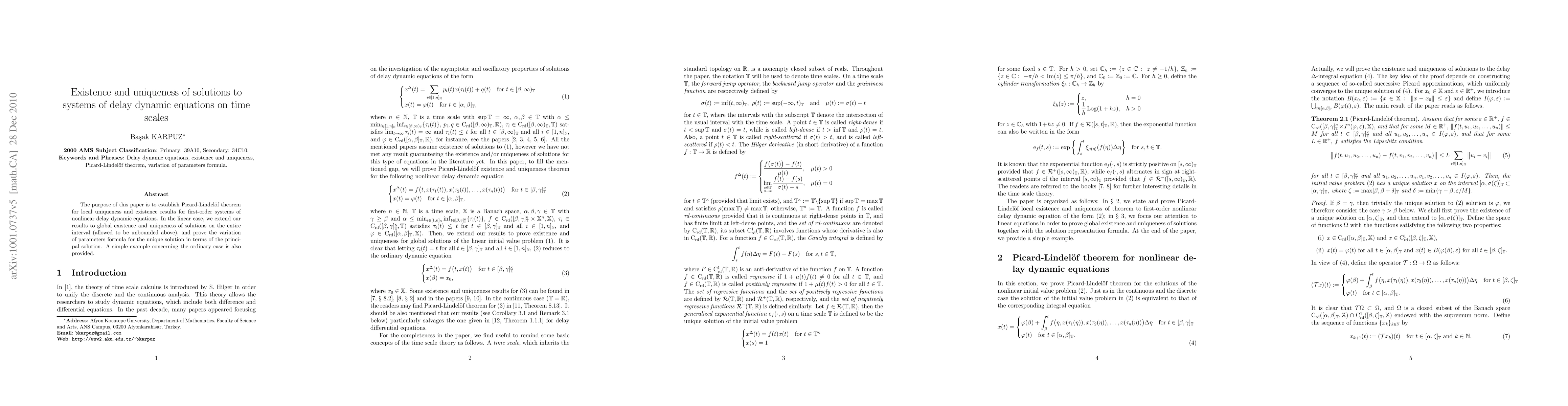 This paper establishes the Picard-Lindel"{o}f theorem for first-order systems of nonlinear delay dynamic equations, proving local uniqueness and existence results, as well as global existence and uniqueness on unbounded intervals in the linear case.
