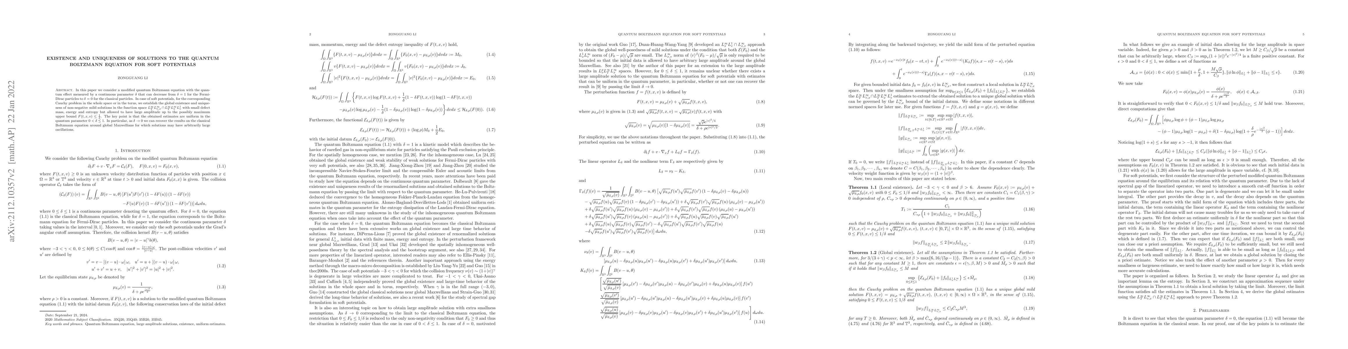 In this paper we consider a modified quantum Boltzmann equation with the quantum effect measured by a continuous parameter $\delta$ that can decrease from $\delta=1$ for the Fermi-Dirac particles to $\delta=0$ for the classical particles. In case of soft potentials, for the corresponding Cauchy problem in the whole space or in the torus, we establish the global existence and uniqueness of non-negative mild solutions in the function space $L^{\infty}_{T}L^{\infty}_{v,x}\cap L^{\infty}_{T}L^{\infty}_{x}L^1_v$ with small defect mass, energy and entropy but allowed to have large amplitude up to the possibly maximum upper bound $F(t,x,v)\leq \frac{1}{\delta}$. The key point is that the obtained estimates are uniform in the quantum parameter $0< \delta\leq1$. In particular, as $\delta\to 0$ we can recover the results on the classical Boltzmann equation around global Maxwellians for which solutions may have arbitrarily large oscillations.
