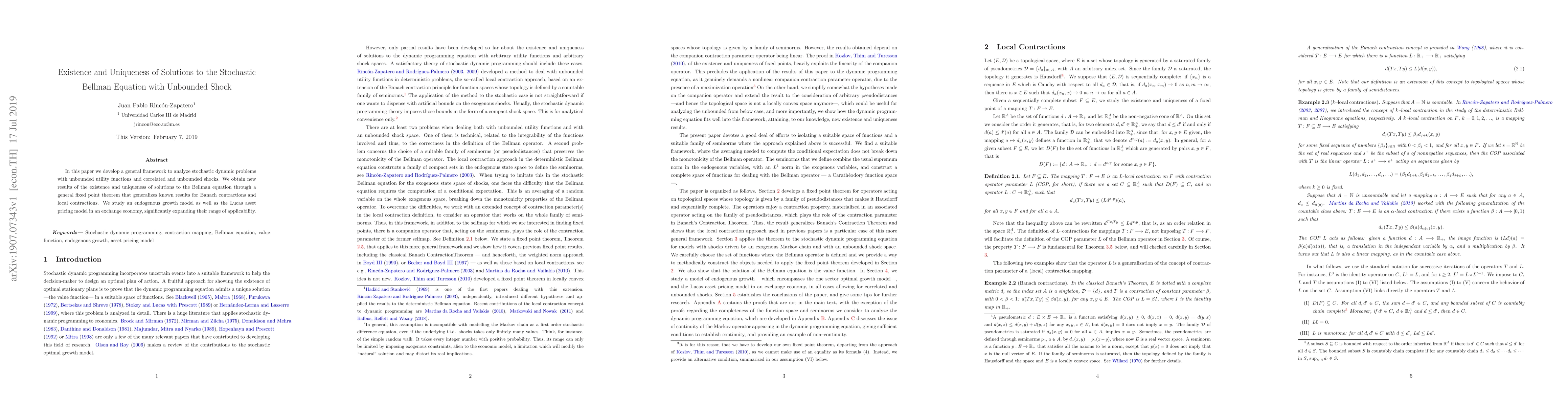 This paper establishes a framework for analyzing stochastic dynamic problems with unbounded utility and shocks, proving the existence and uniqueness of solutions to the Bellman equation via a generalized fixed point theorem. It extends the applicability of the endogenous growth model and Lucas asset pricing model.