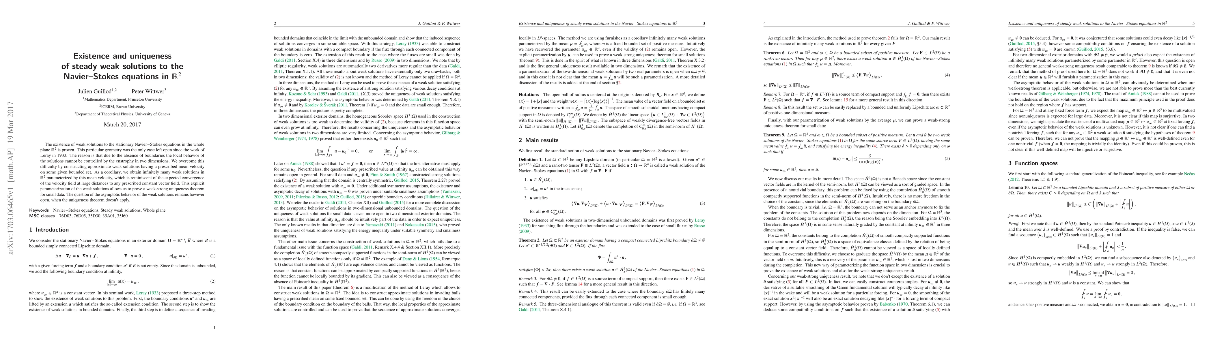 The paper proves the existence of weak solutions to stationary Navier-Stokes equations in two dimensions, with infinitely many solutions parameterized by mean velocity, and a weak-strong uniqueness theorem for small data.