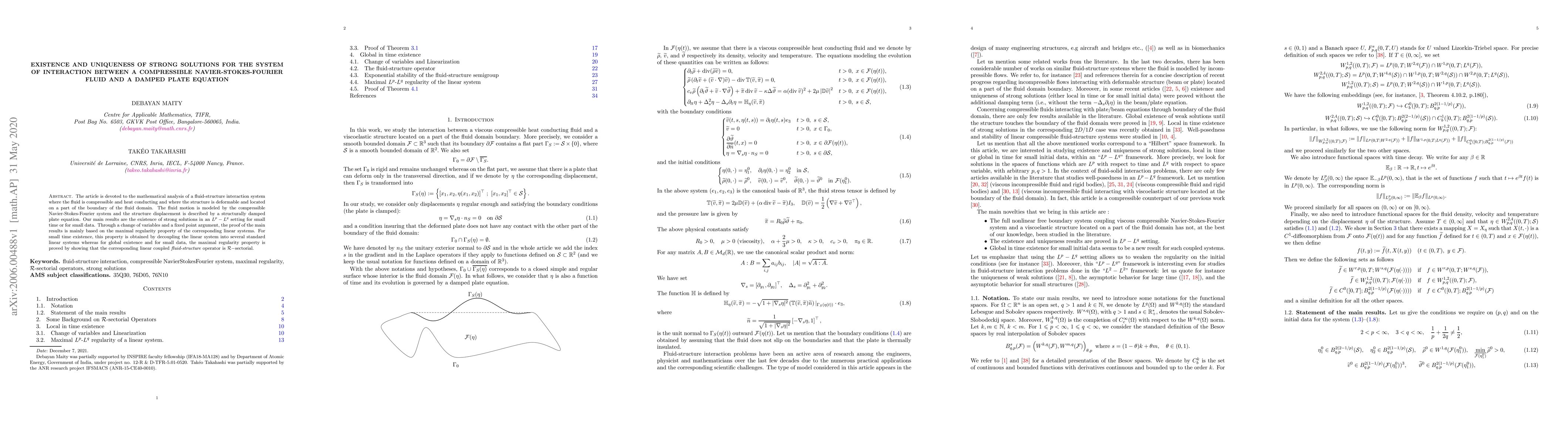 The article is devoted to the mathematical analysis of a fluid-structure interaction system where the fluid is compressible and heat conducting and where the structure is deformable and located on a part of the boundary of the fluid domain. The fluid motion is modeled by the compressible Navier-Stokes-Fourier system and the structure displacement is described by a structurally damped plate equation. Our main results are the existence of strong solutions in an $L^p-L^q$ setting for small time or for small data. Through a change of variables and a fixed point argument, the proof of the main results is mainly based on the maximal regularity property of the corresponding linear systems. For small time existence, this property is obtained by decoupling the linear system into several standard linear systems whereas for global existence and for small data, the maximal regularity property is proved by showing that the corresponding linear coupled {\em fluid-structure} operator is $\mathcal{R}-$sectorial.
