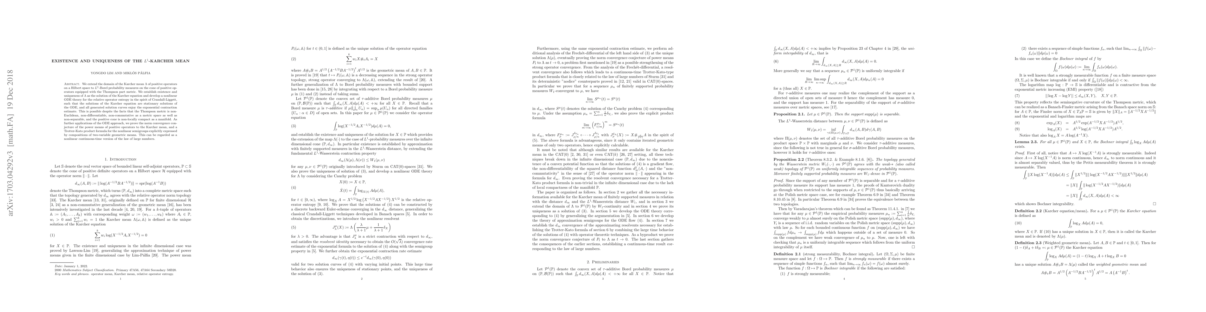 We extend the domain of the Karcher mean $\Lambda$ of positive operators on a Hilbert space to $L^1$-Borel probability measures on the cone of positive operators equipped with the Thompson part metric. We establish existence and uniqueness of $\Lambda$ as the solution of the Karcher equation and develop a nonlinear ODE theory for the relative operator entropy in the spirit of Crandall-Liggett, such that the solutions of the Karcher equation are stationary solutions of the ODE, and all generated solution curves enjoy the exponential contraction estimate. This is possible despite the facts that the Thompson metric is non-Euclidean, non-differentiable, non-commutative as a metric space as well as non-separable, and the positive cone is non-locally compact as a manifold. As further applications of the ODE approach, we prove the norm convergence conjecture of the power means of positive operators to the Karcher mean, and a Trotter-Kato product formula for the nonlinear semigroups explicitly expressed by compositions of two-variable geometric means. This can be regarded as a nonlinear continuous-time version of the law of large numbers.