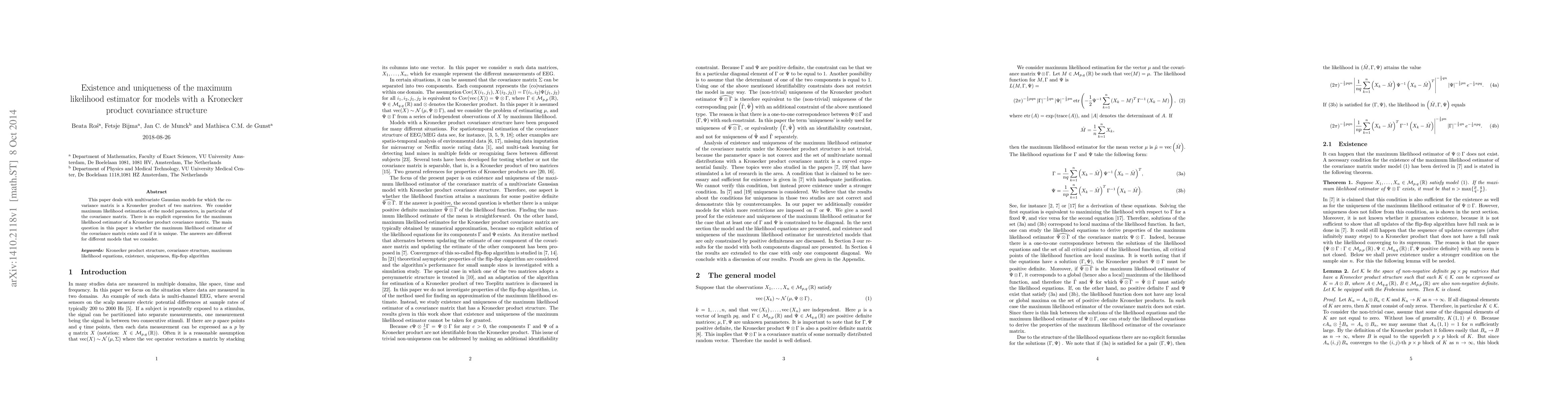This paper deals with multivariate Gaussian models for which the covariance matrix is a Kronecker product of two matrices. We consider maximum likelihood estimation of the model parameters, in particular of the covariance matrix. There is no explicit expression for the maximum likelihood estimator of a Kronecker product covariance matrix. The main question in this paper is whether the maximum likelihood estimator of the covariance matrix exists and if it is unique. The answers are different for different models that we consider.