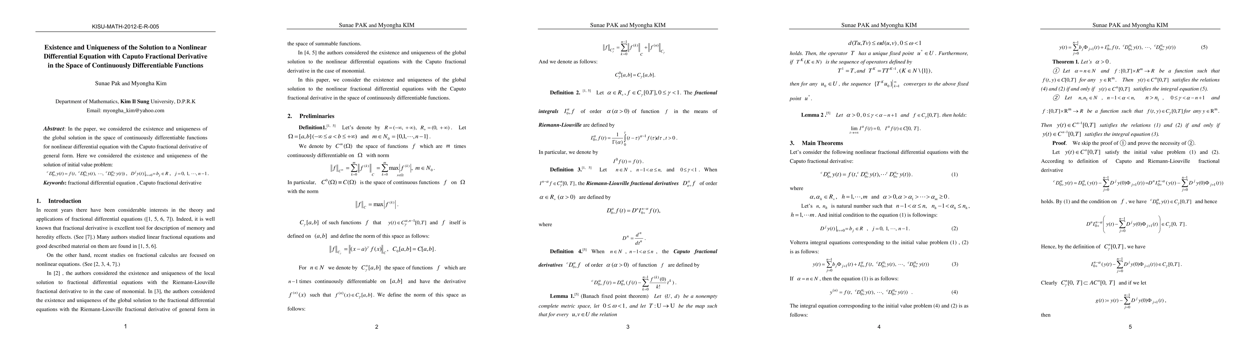 Summary: This paper investigates the existence and uniqueness of global solutions for a nonlinear differential equation with a Caputo fractional derivative in the space of continuously differentiable functions. The authors derive an equivalent integral equation and utilize the Banach fixed point theorem to establish the results.