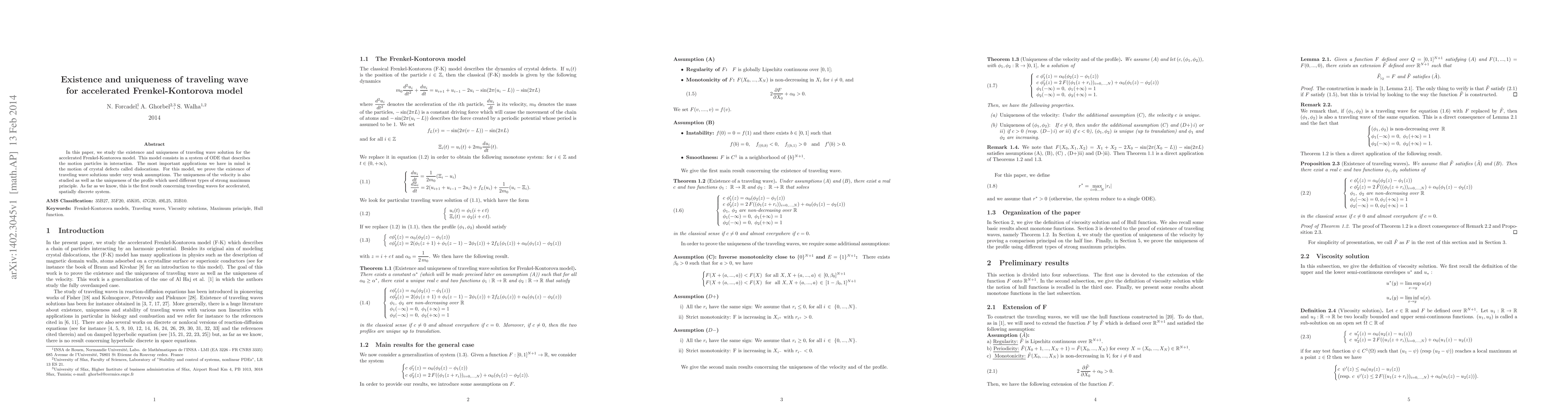 This research proves the existence and uniqueness of traveling wave solutions for the accelerated Frenkel-Kontorova model, a system of ODEs describing particle motion in interaction. It's the first result on traveling waves for accelerated, spatially discrete systems, with applications in crystal defect motion.