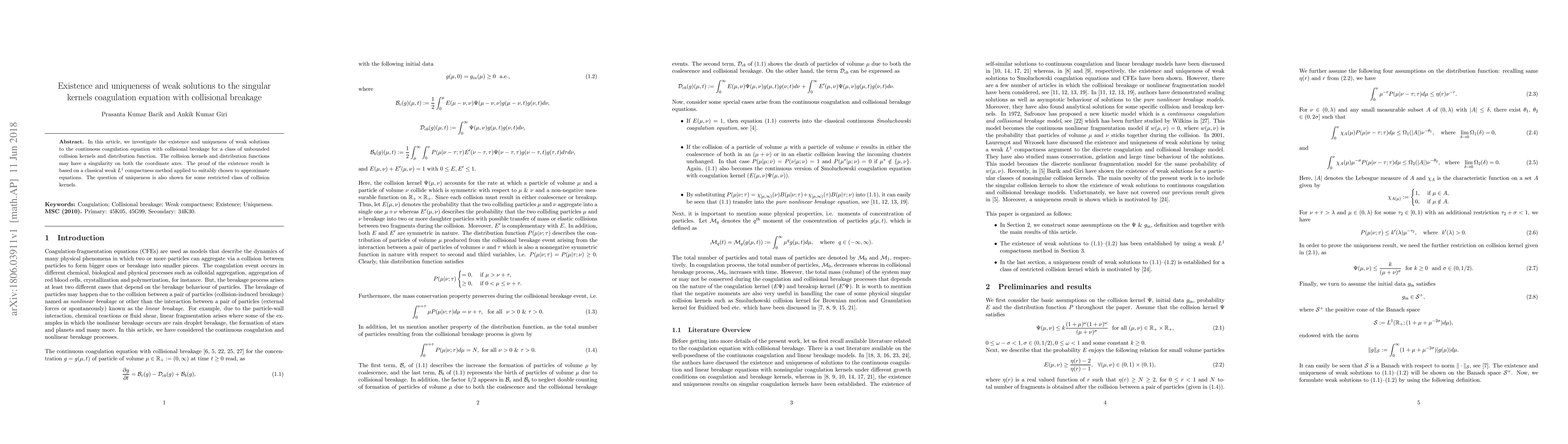 This paper explores the existence and uniqueness of weak solutions for the coagulation equation with collisional breakage involving singular kernels and distribution functions. The existence is proven using a weak L^1 compactness method, while uniqueness is established for a restricted class of collision kernels.