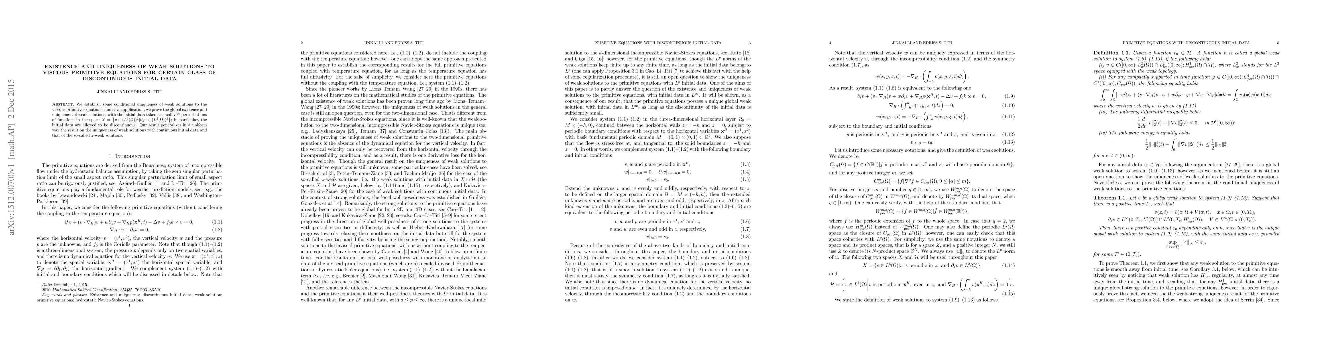 This paper establishes conditional uniqueness and proves global existence and uniqueness of weak solutions to the viscous primitive equations, even for discontinuous initial data that are small perturbations of functions in a specified function space. The result generalizes previous findings on continuous and $z$-weak solutions.